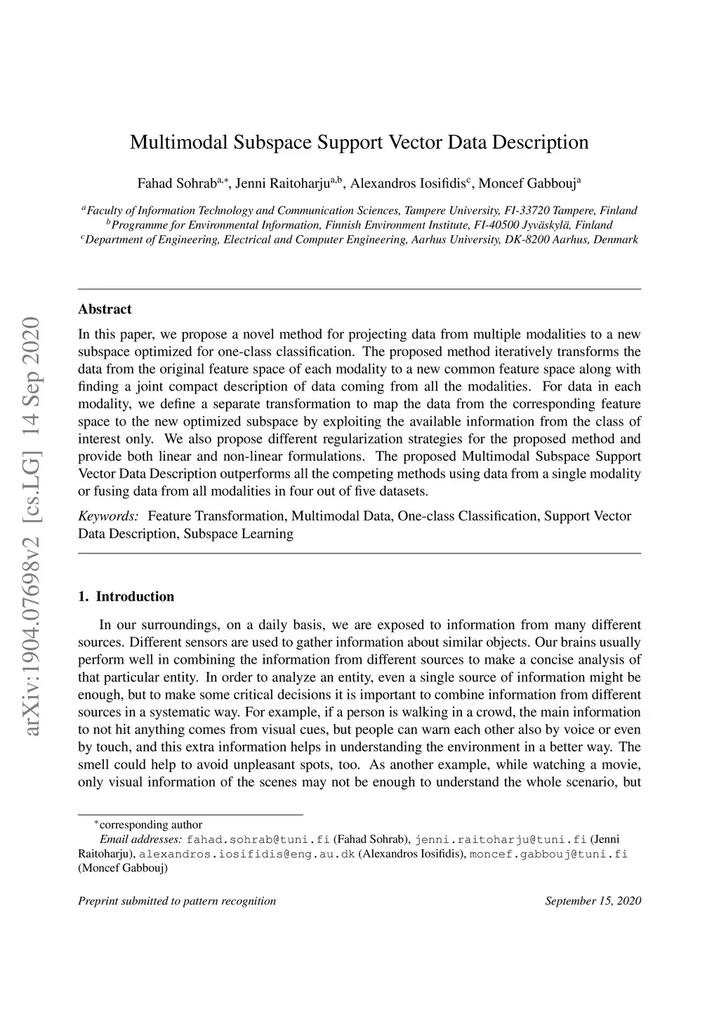 In this paper, we propose a novel method for projecting data from multiple modalities to a new subspace optimized for one-class classification. The proposed method iteratively transforms the data from the original feature space of each modality to a new common feature space along with finding a joint compact description of data coming from all the modalities. For data in each modality, we define a separate transformation to map the data from the corresponding feature space to the new optimized subspace by exploiting the available information from the class of interest only. The data description in the new subspace is obtained by Support Vector Data Description. We also propose different regularization strategies for the proposed method and provide both linear and non-linear formulation. We conduct experiments on two multimodal datasets and compare the proposed approach with baseline and recently proposed one-class classification methods combined with early fusion and also considering each modality separately. We show that the proposed Multimodal Subspace Support Vector Data Description outperforms all the methods using data from a single modality and performs better or equally well than the methods fusing data from all modalities.