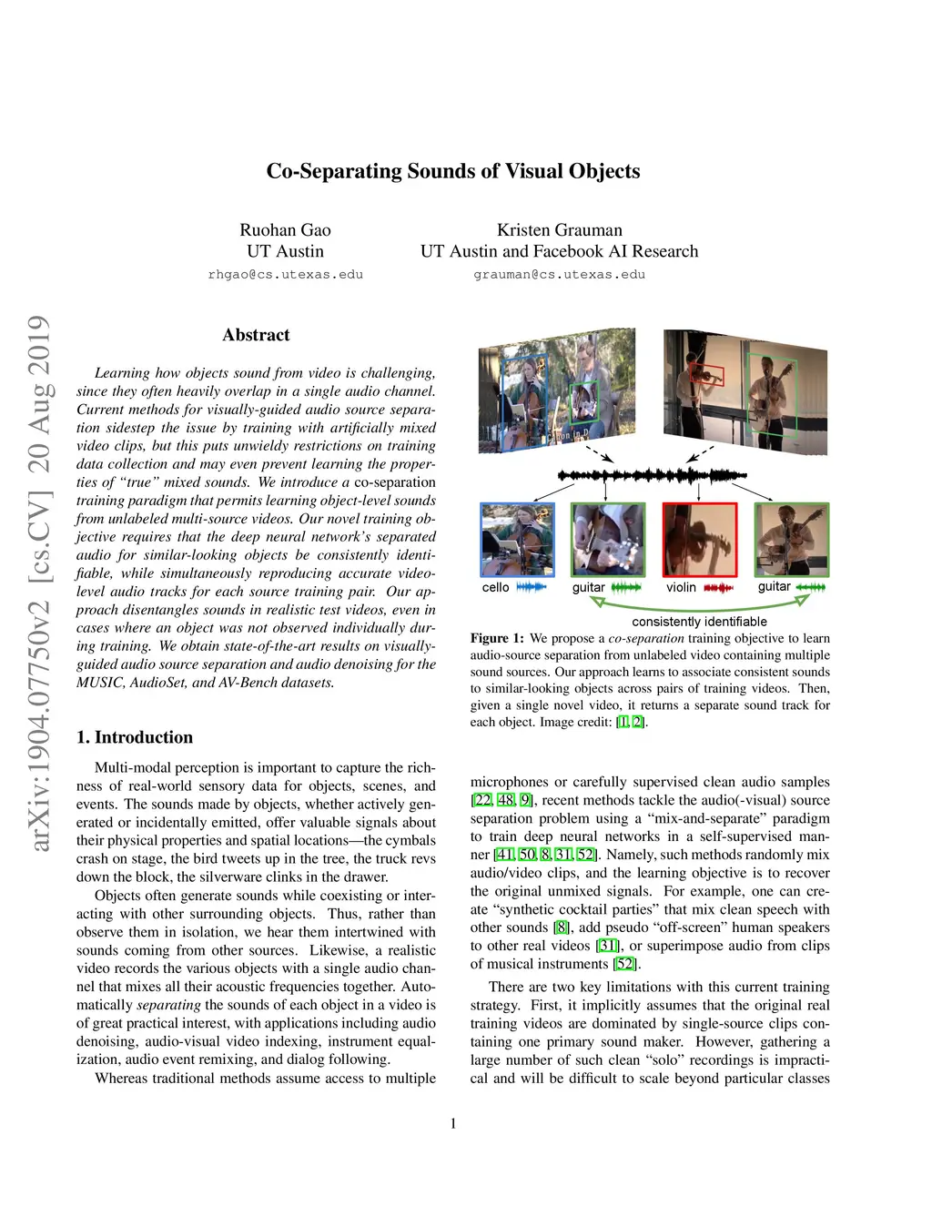 Learning how objects sound from video is challenging, since they often heavily overlap in a single audio channel. Current methods for visually-guided audio source separation sidestep the issue by training with artificially mixed video clips, but this puts unwieldy restrictions on training data collection and may even prevent learning the properties of "true" mixed sounds. We introduce a co-separation training paradigm that permits learning object-level sounds from unlabeled multi-source videos. Our novel training objective requires that the deep neural network's separated audio for similar-looking objects be consistently identifiable, while simultaneously reproducing accurate video-level audio tracks for each source training pair. Our approach disentangles sounds in realistic test videos, even in cases where an object was not observed individually during training. We obtain state-of-the-art results on visually-guided audio source separation and audio denoising for the MUSIC, AudioSet, and AV-Bench datasets.