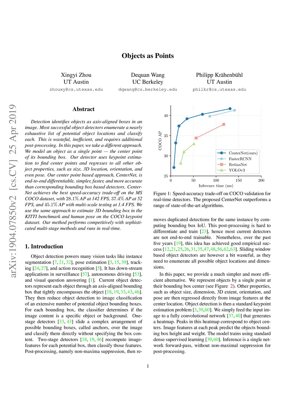 Detection identifies objects as axis-aligned boxes in an image. Most successful object detectors enumerate a nearly exhaustive list of potential object locations and classify each. This is wasteful, inefficient, and requires additional post-processing. In this paper, we take a different approach. We model an object as a single point --- the center point of its bounding box. Our detector uses keypoint estimation to find center points and regresses to all other object properties, such as size, 3D location, orientation, and even pose. Our center point based approach, CenterNet, is end-to-end differentiable, simpler, faster, and more accurate than corresponding bounding box based detectors. CenterNet achieves the best speed-accuracy trade-off on the MS COCO dataset, with 28.1% AP at 142 FPS, 37.4% AP at 52 FPS, and 45.1% AP with multi-scale testing at 1.4 FPS. We use the same approach to estimate 3D bounding box in the KITTI benchmark and human pose on the COCO keypoint dataset. Our method performs competitively with sophisticated multi-stage methods and runs in real-time.