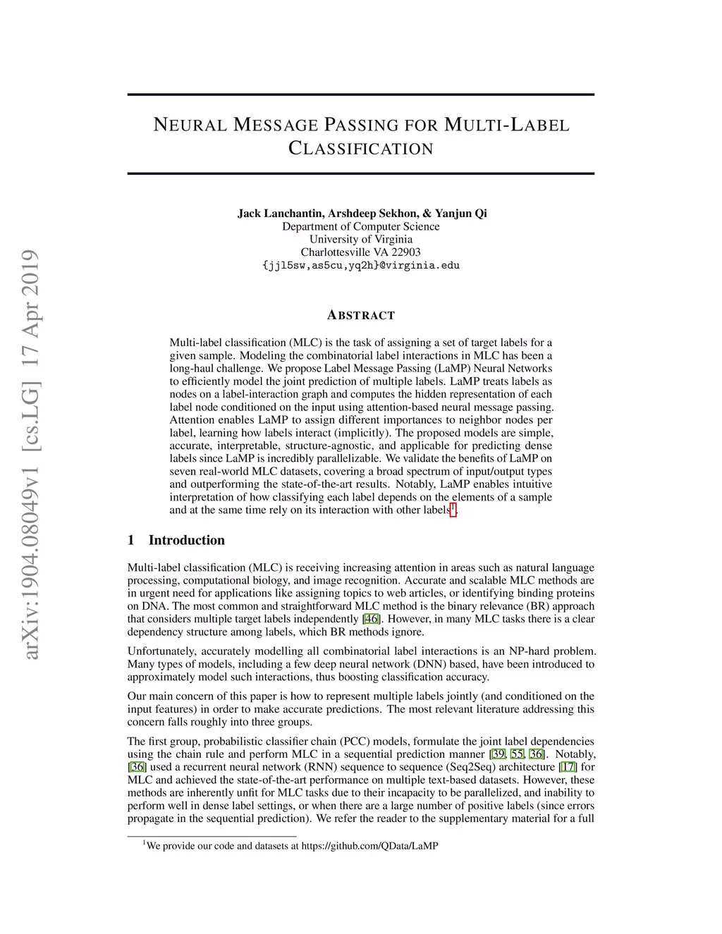 Multi-label classification (MLC) is the task of assigning a set of target labels for a given sample. Modeling the combinatorial label interactions in MLC has been a long-haul challenge. We propose Label Message Passing (LaMP) Neural Networks to efficiently model the joint prediction of multiple labels. LaMP treats labels as nodes on a label-interaction graph and computes the hidden representation of each label node conditioned on the input using attention-based neural message passing. Attention enables LaMP to assign different importance to neighbor nodes per label, learning how labels interact (implicitly). The proposed models are simple, accurate, interpretable, structure-agnostic, and applicable for predicting dense labels since LaMP is incredibly parallelizable. We validate the benefits of LaMP on seven real-world MLC datasets, covering a broad spectrum of input/output types and outperforming the state-of-the-art results. Notably, LaMP enables intuitive interpretation of how classifying each label depends on the elements of a sample and at the same time rely on its interaction with other labels. We provide our code and datasets at https://github.com/QData/LaMP