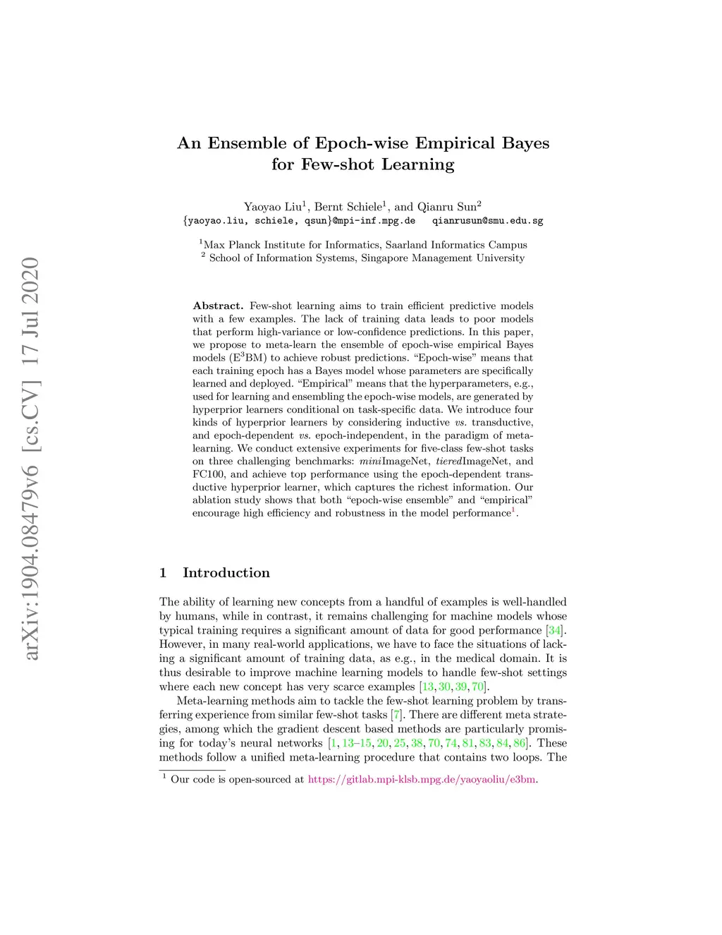 An Ensemble of Epoch-wise Empirical Bayes for Few-shot Learning