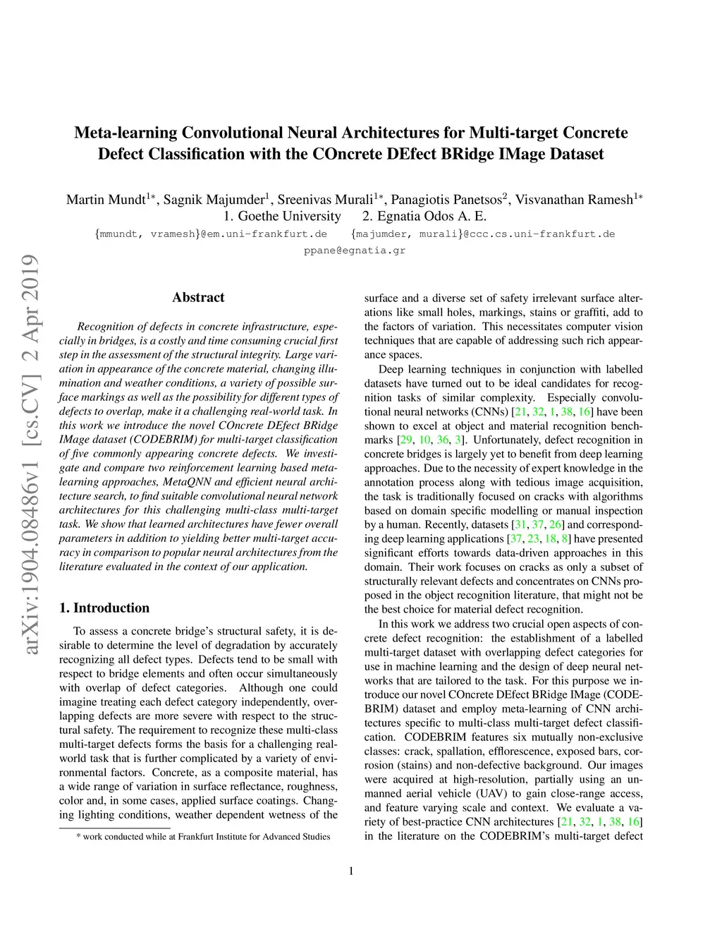 Recognition of defects in concrete infrastructure, especially in bridges, is a costly and time consuming crucial first step in the assessment of the structural integrity. Large variation in appearance of the concrete material, changing illumination and weather conditions, a variety of possible surface markings as well as the possibility for different types of defects to overlap, make it a challenging real-world task. In this work we introduce the novel COncrete DEfect BRidge IMage dataset (CODEBRIM) for multi-target classification of five commonly appearing concrete defects. We investigate and compare two reinforcement learning based meta-learning approaches, MetaQNN and efficient neural architecture search, to find suitable convolutional neural network architectures for this challenging multi-class multi-target task. We show that learned architectures have fewer overall parameters in addition to yielding better multi-target accuracy in comparison to popular neural architectures from the literature evaluated in the context of our application.