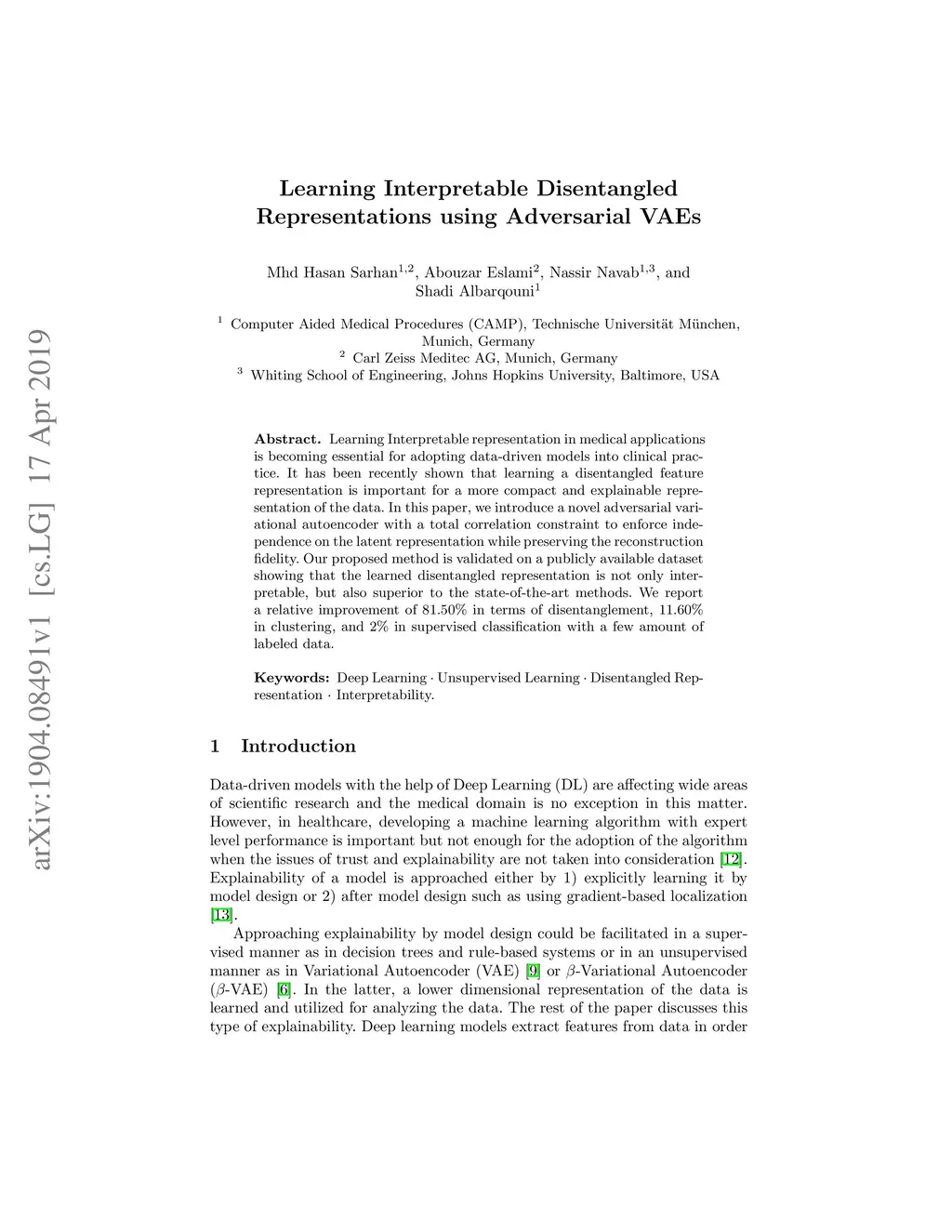 Learning Interpretable representation in medical applications is becoming essential for adopting data-driven models into clinical practice. It has been recently shown that learning a disentangled feature representation is important for a more compact and explainable representation of the data. In this paper, we introduce a novel adversarial variational autoencoder with a total correlation constraint to enforce independence on the latent representation while preserving the reconstruction fidelity. Our proposed method is validated on a publicly available dataset showing that the learned disentangled representation is not only interpretable, but also superior to the state-of-the-art methods. We report a relative improvement of 81.50% in terms of disentanglement, 11.60% in clustering, and 2% in supervised classification with a few amounts of labeled data.