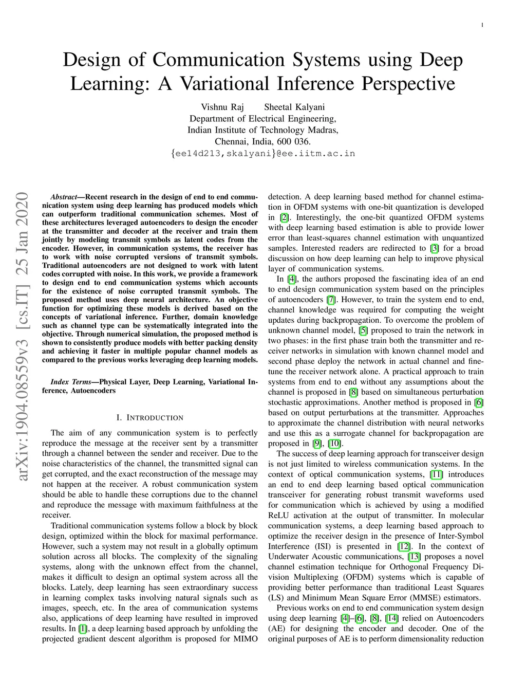 Recent research in the design of end to end communication system using deep learning has produced models which can outperform traditional communication schemes. Most of these architectures leveraged autoencoders to design the encoder at the transmitter and decoder at the receiver and train them jointly by modeling transmit symbols as latent codes from the encoder. However, in communication systems, the receiver has to work with noise corrupted versions of transmit symbols. Traditional autoencoders are not designed to work with latent codes corrupted with noise. In this work, we provide a framework to design end to end communication systems which accounts for the existence of noise corrupted transmit symbols. The proposed method uses deep neural architecture. An objective function for optimizing these models is derived based on the concepts of variational inference. Further, domain knowledge such as channel type can be systematically integrated into the objective. Through numerical simulation, the proposed method is shown to consistently produce models with better packing density and achieving it faster in multiple popular channel models as compared to the previous works leveraging deep learning models.