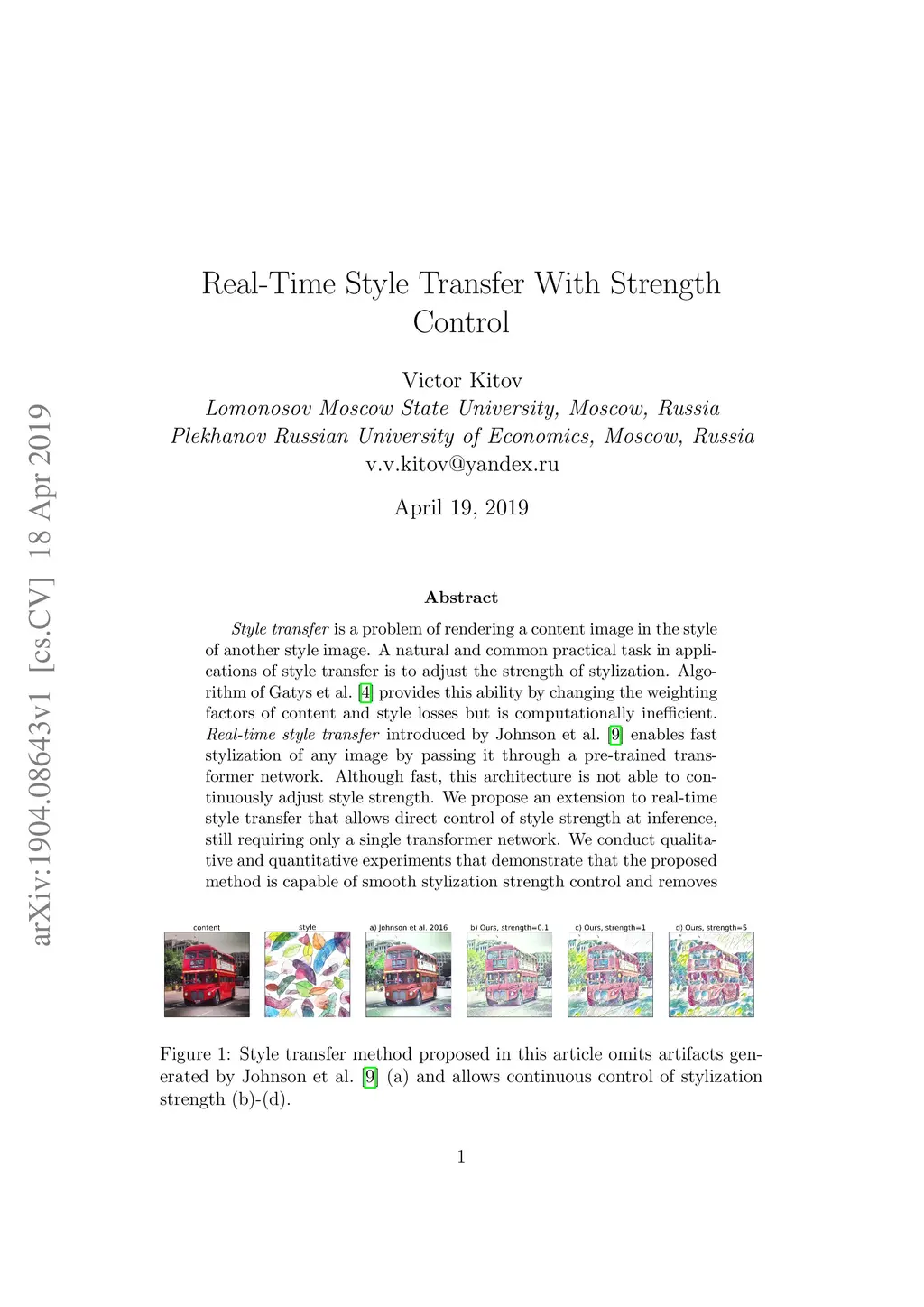 Style transfer is a problem of rendering a content image in the style of another style image. A natural and common practical task in applications of style transfer is to adjust the strength of stylization. Algorithm of Gatys et al. (2016) provides this ability by changing the weighting factors of content and style losses but is computationally inefficient. Real-time style transfer introduced by Johnson et al. (2016) enables fast stylization of any image by passing it through a pre-trained transformer network. Although fast, this architecture is not able to continuously adjust style strength. We propose an extension to real-time style transfer that allows direct control of style strength at inference, still requiring only a single transformer network. We conduct qualitative and quantitative experiments that demonstrate that the proposed method is capable of smooth stylization strength control and removes certain stylization artifacts appearing in the original real-time style transfer method. Comparisons with alternative real-time style transfer algorithms, capable of adjusting stylization strength, show that our method reproduces style with more details.