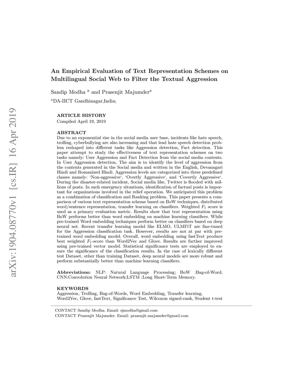 This paper attempt to study the effectiveness of text representation schemes on two tasks namely: User Aggression and Fact Detection from the social media contents. In User Aggression detection, The aim is to identify the level of aggression from the contents generated in the Social media and written in the English, Devanagari Hindi and Romanized Hindi. Aggression levels are categorized into three predefined classes namely: `Non-aggressive`, `Overtly Aggressive`, and `Covertly Aggressive`. During the disaster-related incident, Social media like, Twitter is flooded with millions of posts. In such emergency situations, identification of factual posts is important for organizations involved in the relief operation. We anticipated this problem as a combination of classification and Ranking problem. This paper presents a comparison of various text representation scheme based on BoW techniques, distributed word/sentence representation, transfer learning on classifiers. Weighted score is used as a primary evaluation metric. Results show that text representation using BoW performs better than word embedding on machine learning classifiers. While pre-trained Word embedding techniques perform better on classifiers based on deep neural net. Recent transfer learning model like ELMO, ULMFiT are fine-tuned for the Aggression classification task. However, results are not at par with pre-trained word embedding model. Overall, word embedding using fastText produce best weighted -score than Word2Vec and Glove. Results are further improved using pre-trained vector model. Statistical significance tests are employed to ensure the significance of the classification results. In the case of lexically different test Dataset, other than training Dataset, deep neural models are more robust and perform substantially better than machine learning classifiers.