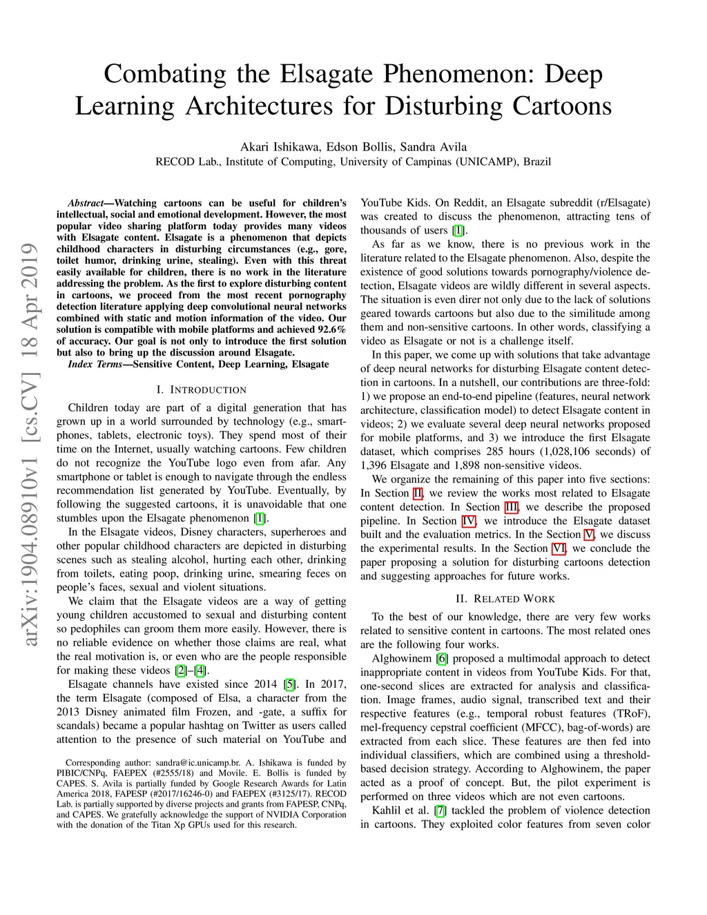Watching cartoons can be useful for children's intellectual, social and emotional development. However, the most popular video sharing platform today provides many videos with Elsagate content. Elsagate is a phenomenon that depicts childhood characters in disturbing circumstances (e.g., gore, toilet humor, drinking urine, stealing). Even with this threat easily available for children, there is no work in the literature addressing the problem. As the first to explore disturbing content in cartoons, we proceed from the most recent pornography detection literature applying deep convolutional neural networks combined with static and motion information of the video. Our solution is compatible with mobile platforms and achieved 92.6% of accuracy. Our goal is not only to introduce the first solution but also to bring up the discussion around Elsagate.