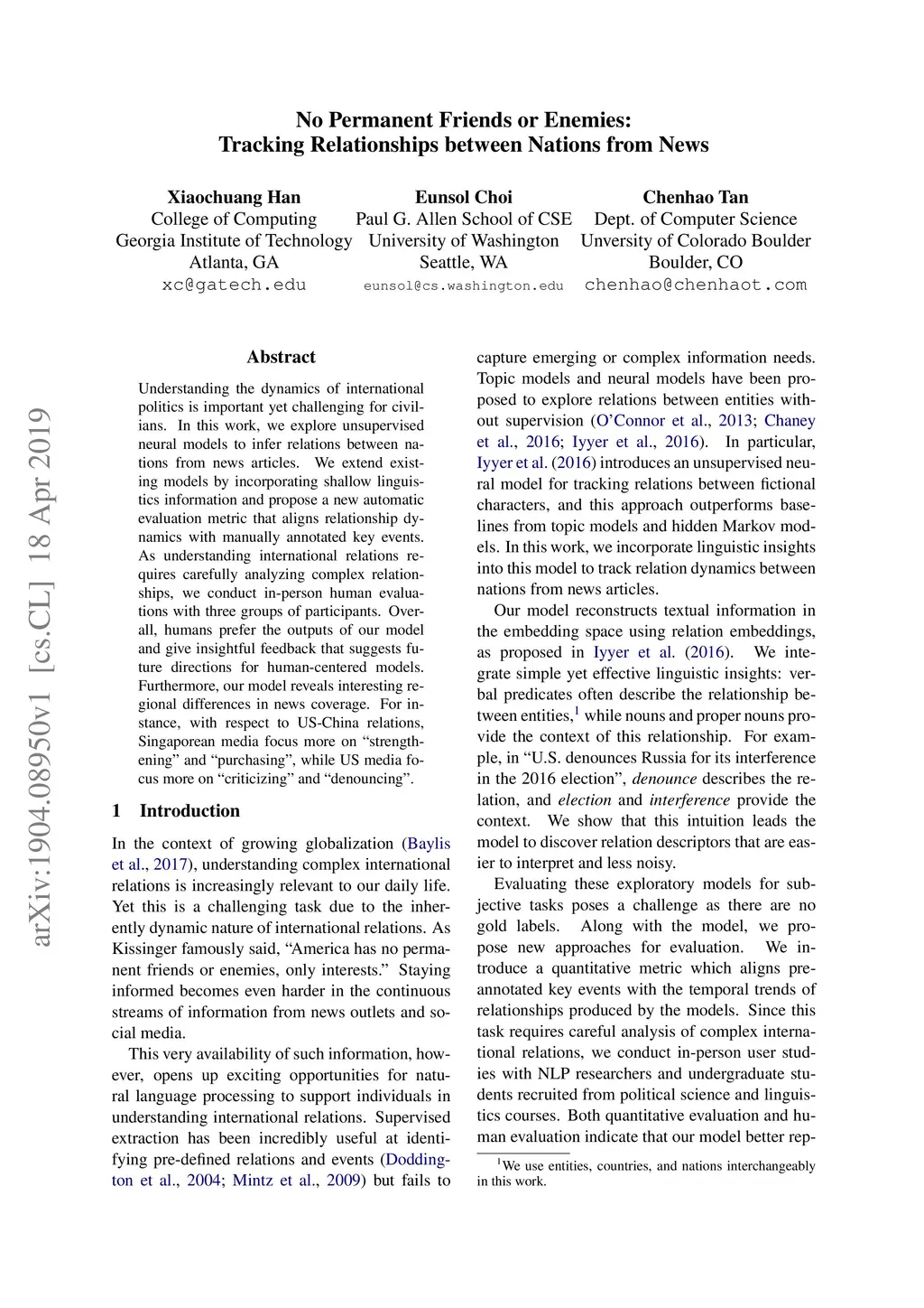 Understanding the dynamics of international politics is important yet challenging for civilians. In this work, we explore unsupervised neural models to infer relations between nations from news articles. We extend existing models by incorporating shallow linguistics information and propose a new automatic evaluation metric that aligns relationship dynamics with manually annotated key events. As understanding international relations requires carefully analyzing complex relationships, we conduct in-person human evaluations with three groups of participants. Overall, humans prefer the outputs of our model and give insightful feedback that suggests future directions for human-centered models. Furthermore, our model reveals interesting regional differences in news coverage. For instance, with respect to US-China relations, Singaporean media focus more on "strengthening" and "purchasing", while US media focus more on "criticizing" and "denouncing".