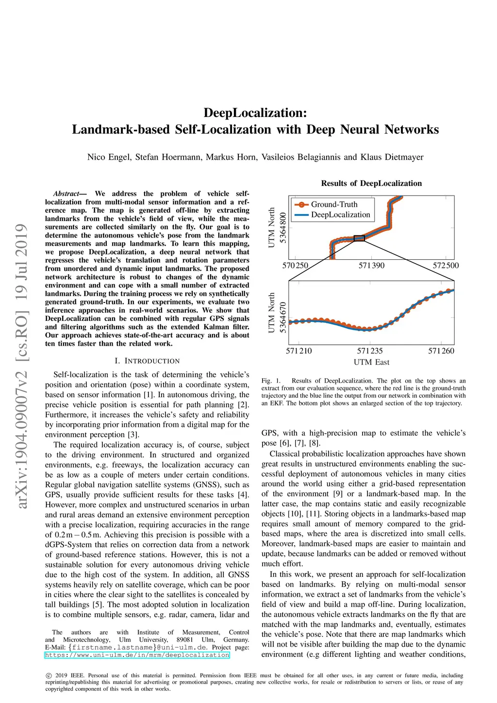 We address the problem of vehicle self-localization from multi-modal sensor information and a reference map. The map is generated off-line by extracting landmarks from the vehicle's field of view, while the measurements are collected similarly on the fly. Our goal is to determine the autonomous vehicle's pose from the landmark measurements and map landmarks. To learn this mapping, we propose DeepLocalization, a deep neural network that regresses the vehicle's translation and rotation parameters from unordered and dynamic input landmarks. The proposed network architecture is robust to changes of the dynamic environment and can cope with a small number of extracted landmarks. During the training process we rely on synthetically generated ground-truth. In our experiments, we evaluate two inference approaches in real-world scenarios. We show that DeepLocalization can be combined with regular GPS signals and filtering algorithms such as the extended Kalman filter. Our approach achieves state-of-the-art accuracy and is about ten times faster than the related work.
