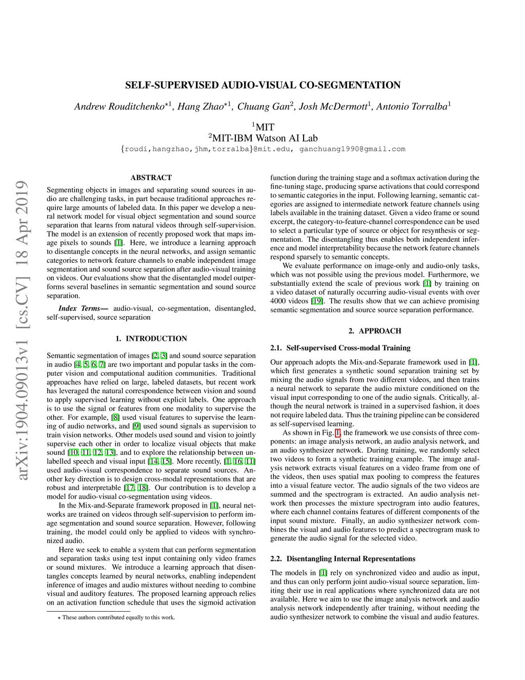 Segmenting objects in images and separating sound sources in audio are challenging tasks, in part because traditional approaches require large amounts of labeled data. In this paper we develop a neural network model for visual object segmentation and sound source separation that learns from natural videos through self-supervision. The model is an extension of recently proposed work that maps image pixels to sounds. Here, we introduce a learning approach to disentangle concepts in the neural networks, and assign semantic categories to network feature channels to enable independent image segmentation and sound source separation after audio-visual training on videos. Our evaluations show that the disentangled model outperforms several baselines in semantic segmentation and sound source separation.