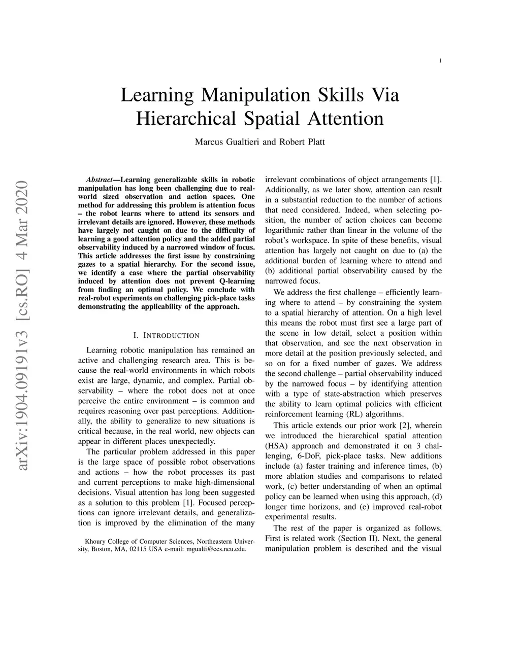 Learning Manipulation Skills Via Hierarchical Spatial Attention