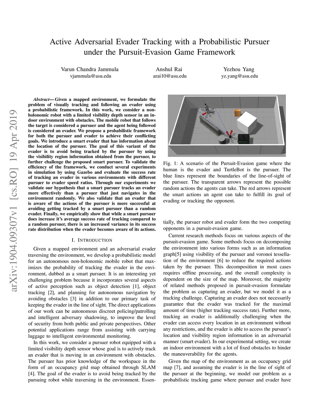 Given a mapped environment, we formulate the problem of visually tracking and following an evader using a probabilistic framework. In this work, we consider a non-holonomic robot with a limited visibility depth sensor in an indoor environment with obstacles. The mobile robot that follows the target is considered a pursuer and the agent being followed is considered an evader. We propose a probabilistic framework for both the pursuer and evader to achieve their conflicting goals. We introduce a smart evader that has information about the location of the pursuer. The goal of this variant of the evader is to avoid being tracked by the pursuer by using the visibility region information obtained from the pursuer, to further challenge the proposed smart pursuer. To validate the efficiency of the framework, we conduct several experiments in simulation by using Gazebo and evaluate the success rate of tracking an evader in various environments with different pursuer to evader speed ratios. Through our experiments we validate our hypothesis that a smart pursuer tracks an evader more effectively than a pursuer that just navigates in the environment randomly. We also validate that an evader that is aware of the actions of the pursuer is more successful at avoiding getting tracked by a smart pursuer than a random evader. Finally, we empirically show that while a smart pursuer does increase it's average success rate of tracking compared to a random pursuer, there is an increased variance in its success rate distribution when the evader becomes aware of its actions.