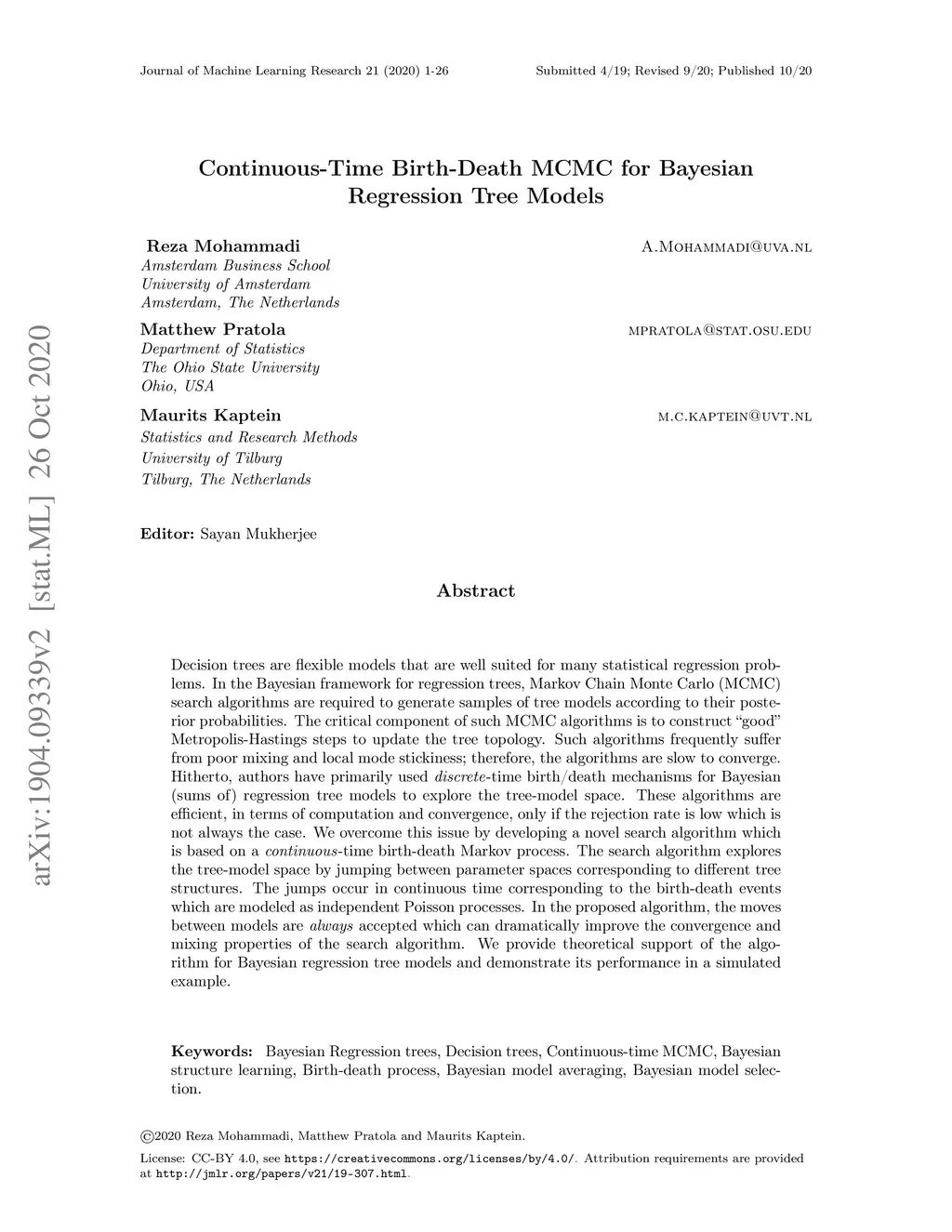 Continuous-Time Birth-Death MCMC for Bayesian Regression Tree Models