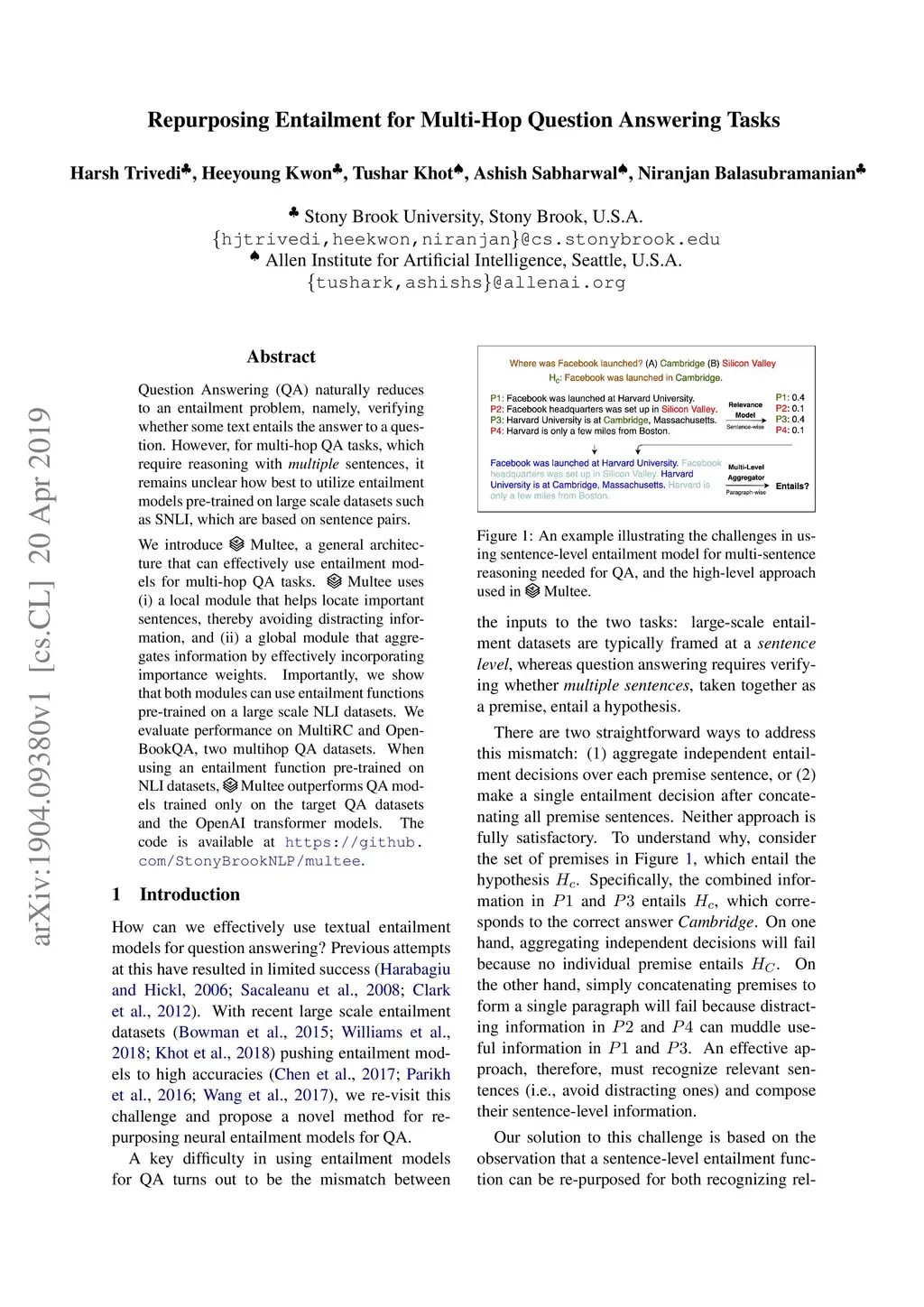 Repurposing Entailment for Multi-Hop Question Answering Tasks
