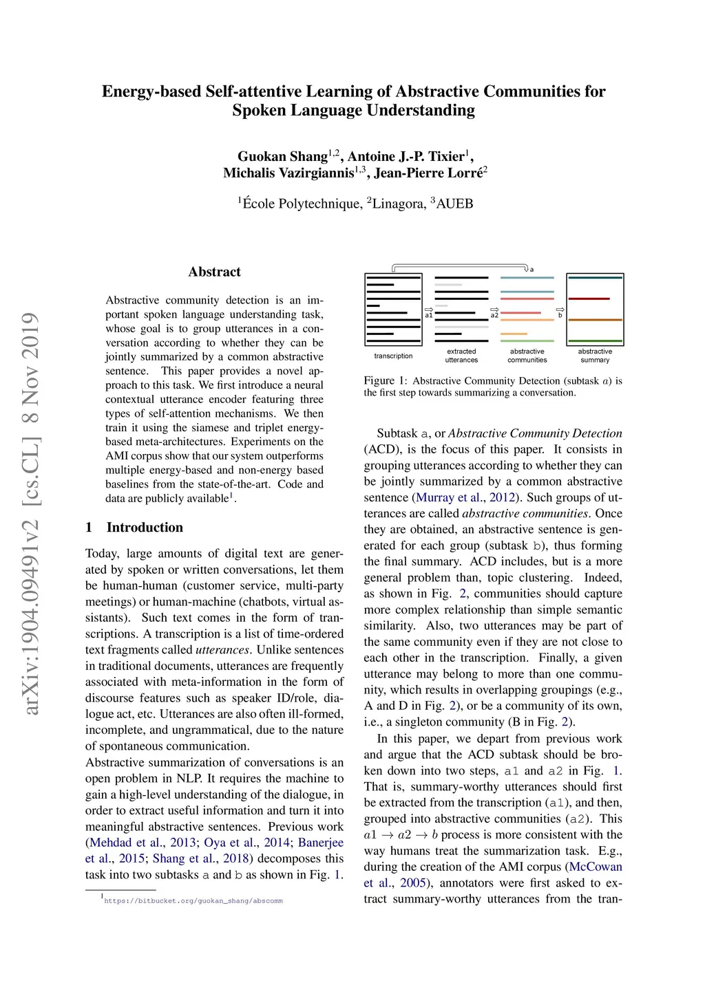 Abstractive community detection is an important spoken language understanding task, whose goal is to group utterances in a conversation according to whether they can be jointly summarized by a common abstractive sentence. This paper provides a novel approach to this task. We first introduce a neural contextual utterance encoder featuring three types of self-attention mechanisms. We then train it using the siamese and triplet energy-based meta-architectures. Experiments on the AMI corpus show that our system outperforms multiple energy-based and non-energy based baselines from the state-of-the-art. Code and data are publicly available.