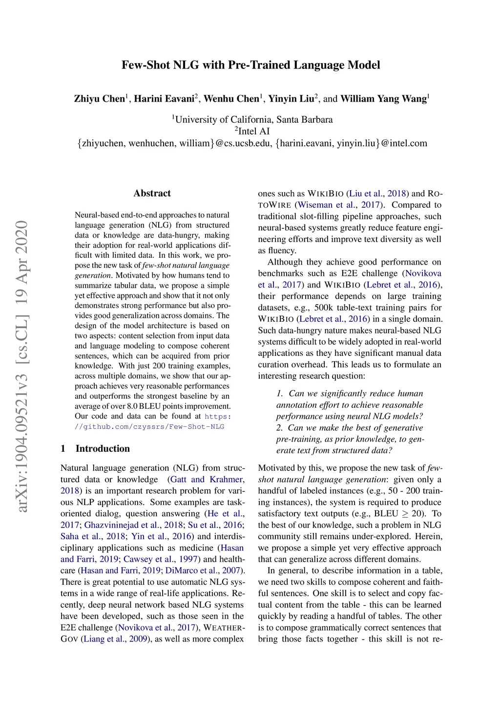Natural language generation (NLG) from structured data or knowledge is essential for many NLP research areas. While previous neural-based end-to-end approaches have made significant progress on several benchmarks, their data-hungry nature makes them hard to be widely adopted for real-world applications. Hence, in this work, we propose the new task of few-shot natural language generation. Motivated by how humans tend to summarize tabulated data, we propose a simple yet effective approach and show that it not only demonstrates strong performance but also provides good generalization across domains. Design on model architecture is based on two aspects: content selection/copying from input data, and language modeling to compose coherent sentences, which can be acquired from prior knowledge. Accordingly, we employ a pre-trained domain-independent language model to serve as the prior, while the content selection/copying can be learned with only a few in-domain training instances, thus attaining the few-shot learning objective. To demonstrate that our approach generalizes across domains, we curated table-to-text data from multiple domains. With just 200 training samples, across all domains, our approach outperforms the strongest baseline by an average of over 8.0 BLEU points. We will make our code and data publicly available.