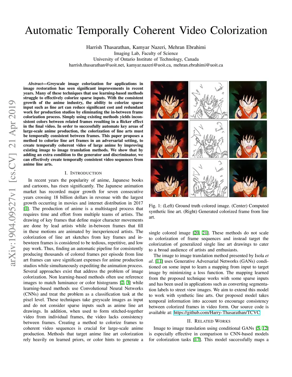 Greyscale image colorization for applications in image restoration has seen significant improvements in recent years. Many of these techniques that use learning-based methods struggle to effectively colorize sparse inputs. With the consistent growth of the anime industry, the ability to colorize sparse input such as line art can reduce significant cost and redundant work for production studios by eliminating the in-between frame colorization process. Simply using existing methods yields inconsistent colors between related frames resulting in a flicker effect in the final video. In order to successfully automate key areas of large-scale anime production, the colorization of line arts must be temporally consistent between frames. This paper proposes a method to colorize line art frames in an adversarial setting, to create temporally coherent video of large anime by improving existing image to image translation methods. We show that by adding an extra condition to the generator and discriminator, we can effectively create temporally consistent video sequences from anime line arts. Code and models available at: https://github.com/Harry-Thasarathan/TCVC