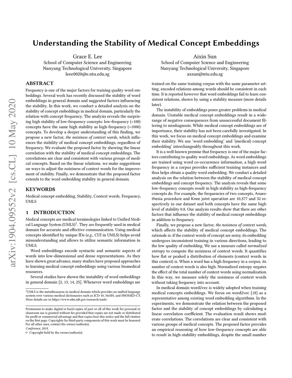 Frequency is one of the major factors for training quality word embeddings. Several work has recently discussed the stability of word embeddings in general domain and suggested factors influencing the stability. In this work, we conduct a detailed analysis on the stability of concept embeddings in medical domain, particularly the relation with concept frequency. The analysis reveals the surprising high stability of low-frequency concepts: low-frequency (<100) concepts have the same high stability as high-frequency (>1000) concepts. To develop a deeper understanding of this finding, we propose a new factor, the noisiness of context words, which influences the stability of medical concept embeddings, regardless of frequency. We evaluate the proposed factor by showing the linear correlation with the stability of medical concept embeddings. The correlations are clear and consistent with various groups of medical concepts. Based on the linear relations, we make suggestions on ways to adjust the noisiness of context words for the improvement of stability. Finally, we demonstrate that the proposed factor extends to the word embedding stability in general domain.