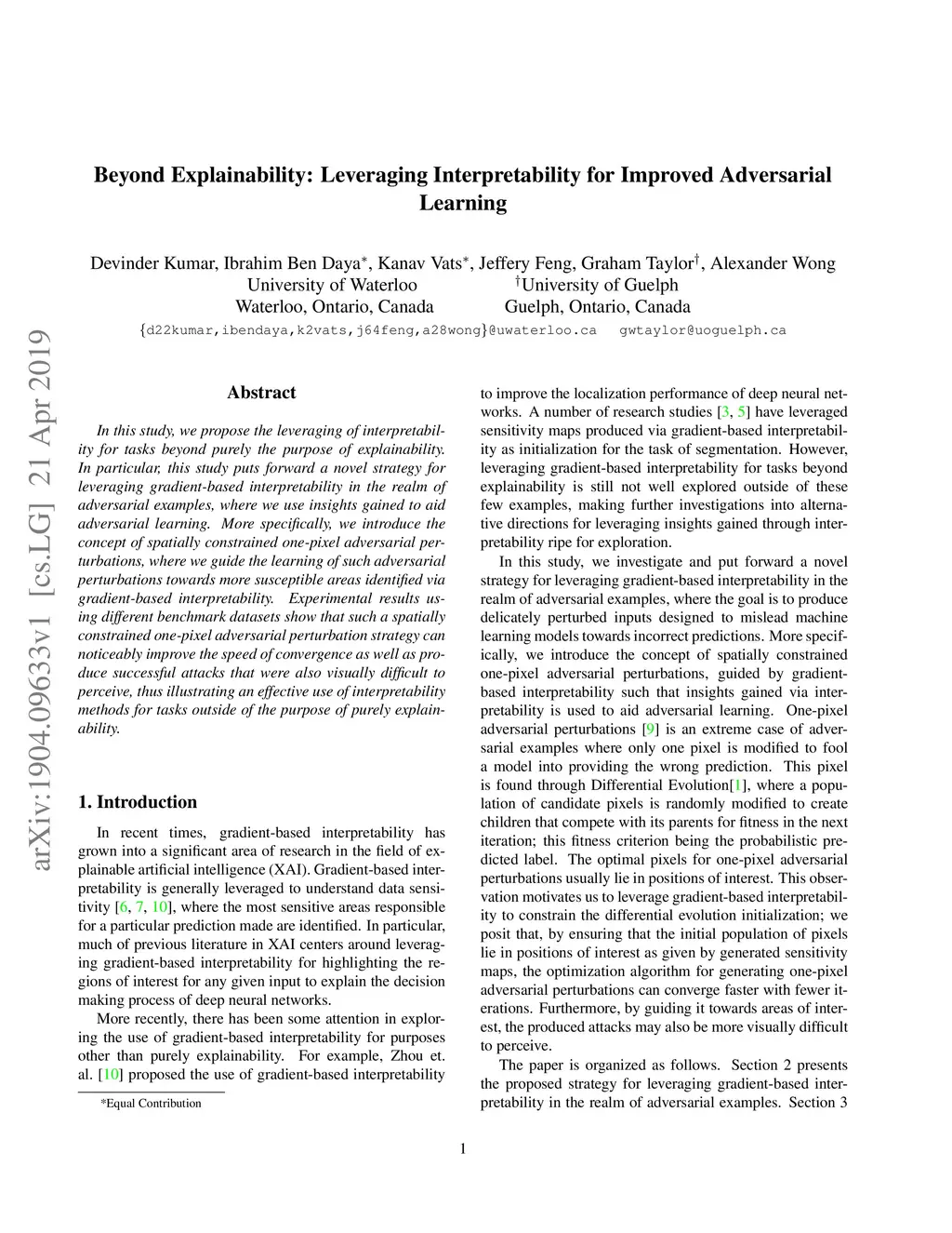 In this study, we propose the leveraging of interpretability for tasks beyond purely the purpose of explainability. In particular, this study puts forward a novel strategy for leveraging gradient-based interpretability in the realm of adversarial examples, where we use insights gained to aid adversarial learning. More specifically, we introduce the concept of spatially constrained one-pixel adversarial perturbations, where we guide the learning of such adversarial perturbations towards more susceptible areas identified via gradient-based interpretability. Experimental results using different benchmark datasets show that such a spatially constrained one-pixel adversarial perturbation strategy can noticeably improve the speed of convergence as well as produce successful attacks that were also visually difficult to perceive, thus illustrating an effective use of interpretability methods for tasks outside of the purpose of purely explainability.