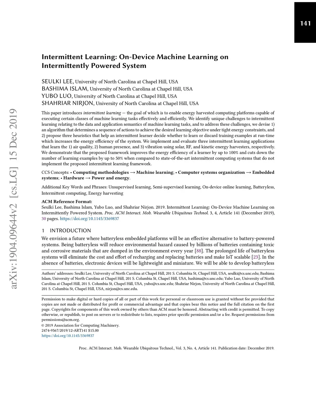 Intermittent Learning: On-Device Machine Learning on Intermittently