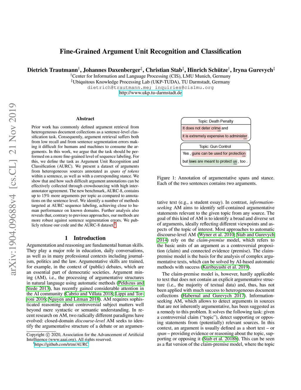 Prior work has commonly defined argument retrieval from heterogeneous document collections as a sentence-level classification task. Consequently, argument retrieval suffers both from low recall and from sentence segmentation errors making it difficult for humans and machines to consume the arguments. In this work, we argue that the task should be performed on a more fine-grained level of sequence labeling. For this, we define the task as Argument Unit Recognition and Classification (AURC). We present a dataset of arguments from heterogeneous sources annotated as spans of tokens within a sentence, as well as with a corresponding stance. We show that and how such difficult argument annotations can be effectively collected through crowdsourcing with high interannotator agreement. The new benchmark, AURC-8, contains up to 15% more arguments per topic as compared to annotations on the sentence level. We identify a number of methods targeted at AURC sequence labeling, achieving close to human performance on known domains. Further analysis also reveals that, contrary to previous approaches, our methods are more robust against sentence segmentation errors. We publicly release our code and the AURC-8 dataset.