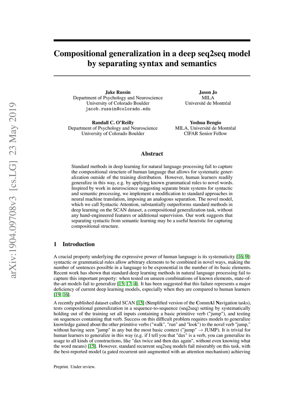 Standard methods in deep learning for natural language processing fail to capture the compositional structure of human language that allows for systematic generalization outside of the training distribution. However, human learners readily generalize in this way, e.g. by applying known grammatical rules to novel words. Inspired by work in neuroscience suggesting separate brain systems for syntactic and semantic processing, we implement a modification to standard approaches in neural machine translation, imposing an analogous separation. The novel model, which we call Syntactic Attention, substantially outperforms standard methods in deep learning on the SCAN dataset, a compositional generalization task, without any hand-engineered features or additional supervision. Our work suggests that separating syntactic from semantic learning may be a useful heuristic for capturing compositional structure.