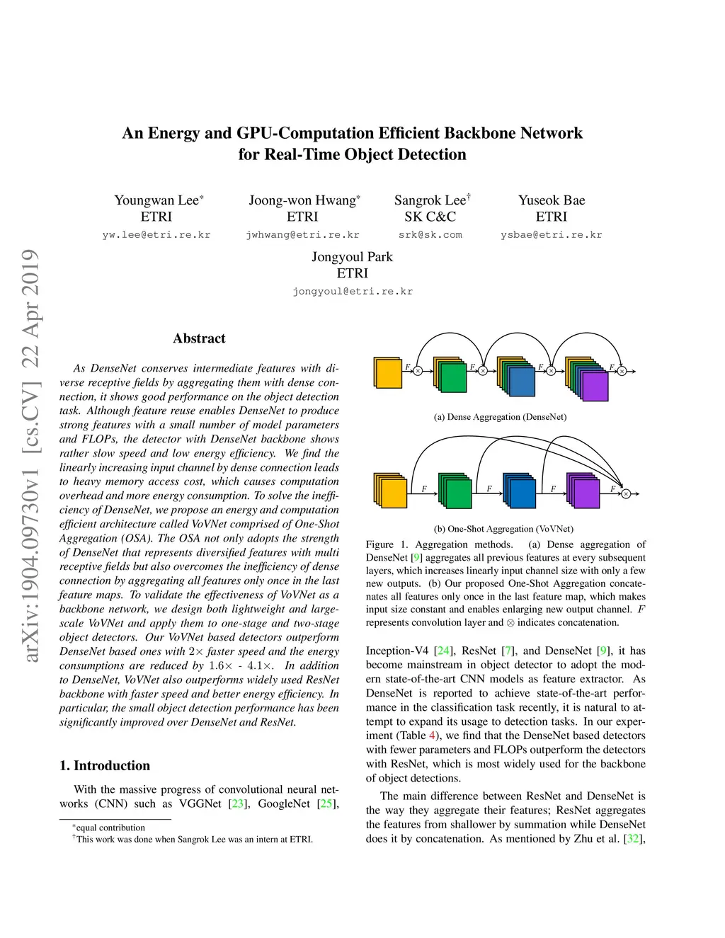 As DenseNet conserves intermediate features with diverse receptive fields by aggregating them with dense connection, it shows good performance on the object detection task. Although feature reuse enables DenseNet to produce strong features with a small number of model parameters and FLOPs, the detector with DenseNet backbone shows rather slow speed and low energy efficiency. We find the linearly increasing input channel by dense connection leads to heavy memory access cost, which causes computation overhead and more energy consumption. To solve the inefficiency of DenseNet, we propose an energy and computation efficient architecture called VoVNet comprised of One-Shot Aggregation (OSA). The OSA not only adopts the strength of DenseNet that represents diversified features with multi receptive fields but also overcomes the inefficiency of dense connection by aggregating all features only once in the last feature maps. To validate the effectiveness of VoVNet as a backbone network, we design both lightweight and large-scale VoVNet and apply them to one-stage and two-stage object detectors. Our VoVNet based detectors outperform DenseNet based ones with 2x faster speed and the energy consumptions are reduced by 1.6x - 4.1x. In addition to DenseNet, VoVNet also outperforms widely used ResNet backbone with faster speed and better energy efficiency. In particular, the small object detection performance has been significantly improved over DenseNet and ResNet.