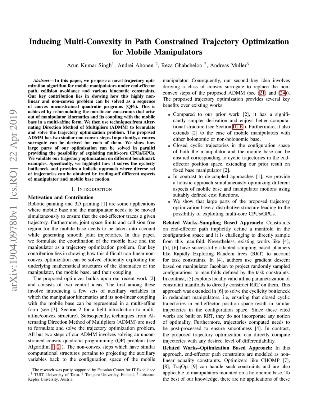 In this paper, we propose a novel trajectory optimization algorithm for mobile manipulators under end-effector path, collision avoidance and various kinematic constraints. Our key contribution lies in showing how this highly non-linear and non-convex problem can be solved as a sequence of convex unconstrained quadratic programs (QPs). This is achieved by reformulating the non-linear constraints that arise out of manipulator kinematics and its coupling with the mobile base in a multi-affine form. We then use techniques from Alternating Direction Method of Multipliers (ADMM) to formulate and solve the trajectory optimization problem. The proposed ADMM has two similar non-convex steps. Importantly, a convex surrogate can be derived for each of them. We show how large parts of our optimization can be solved in parallel providing the possibility of exploiting multi-core CPUs/GPUs. We validate our trajectory optimization on different benchmark examples. Specifically, we highlight how it solves the cyclicity bottleneck and provides a holistic approach where diverse set of trajectories can be obtained by trading-off different aspects of manipulator and mobile base motion.