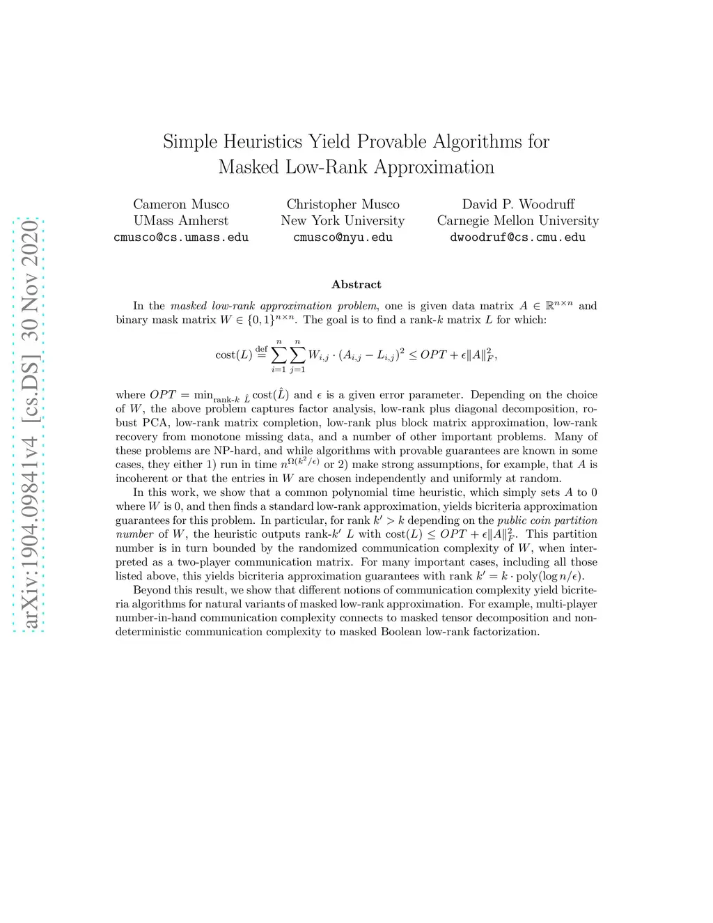 In , one is given and binary mask matrix . The goal is to find a rank- matrix for which: where and is a given error parameter. Depending on the choice of , this problem captures factor analysis, low-rank plus diagonal decomposition, robust PCA, low-rank matrix completion, low-rank plus block matrix approximation, and many problems. Many of these problems are NP-hard, and while some algorithms with provable guarantees are known, they either 1) run in time or 2) make strong assumptions, e.g., that is incoherent or that is random. In this work, we show that a common polynomial time heuristic, which simply sets to where is , and then finds a standard low-rank approximation, yields bicriteria approximation guarantees for this problem. In particular, for rank depending on the of , the heuristic outputs rank- with cost. This partition number is in turn bounded by the of , when interpreted as a two-player communication matrix. For many important examples of masked low-rank approximation, including all those listed above, this result yields bicriteria approximation guarantees with . Further, we show that different models of communication yield algorithms for natural variants of masked low-rank approximation. For example, multi-player number-in-hand communication complexity connects to masked tensor decomposition and non-deterministic communication complexity to masked Boolean low-rank factorization.