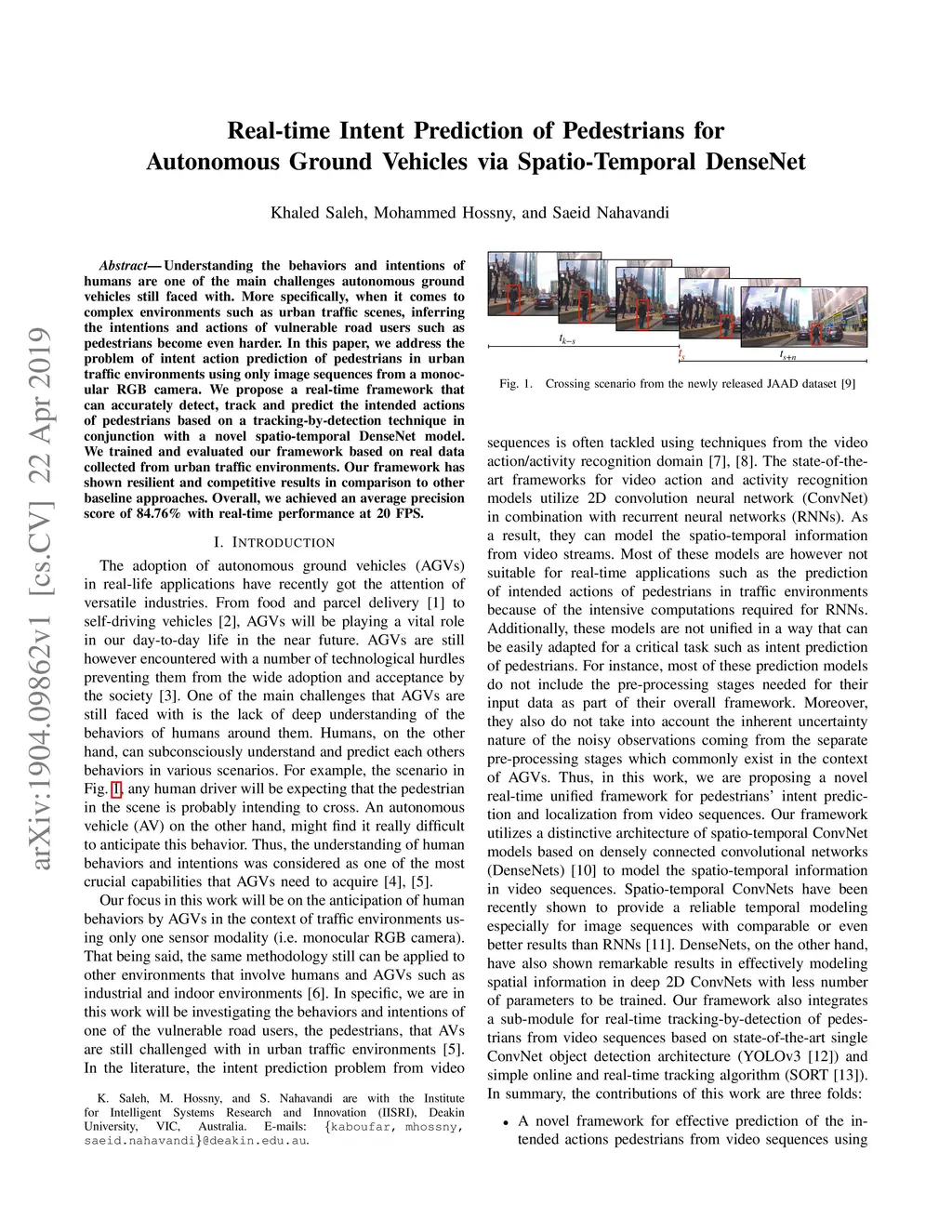Understanding the behaviors and intentions of humans are one of the main challenges autonomous ground vehicles still faced with. More specifically, when it comes to complex environments such as urban traffic scenes, inferring the intentions and actions of vulnerable road users such as pedestrians become even harder. In this paper, we address the problem of intent action prediction of pedestrians in urban traffic environments using only image sequences from a monocular RGB camera. We propose a real-time framework that can accurately detect, track and predict the intended actions of pedestrians based on a tracking-by-detection technique in conjunction with a novel spatio-temporal DenseNet model. We trained and evaluated our framework based on real data collected from urban traffic environments. Our framework has shown resilient and competitive results in comparison to other baseline approaches. Overall, we achieved an average precision score of 84.76% with a real-time performance at 20 FPS.