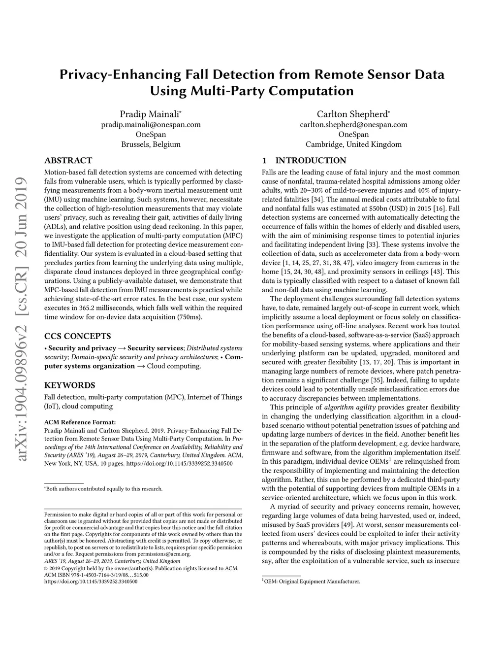 Motion-based fall detection systems are concerned with detecting falls from vulnerable users, which is typically performed by classifying measurements from a body-worn inertial measurement unit (IMU) using machine learning. Such systems, however, necessitate the collection of high-resolution measurements that may violate users' privacy, such as revealing their gait, activities of daily living (ADLs), and relative position using dead reckoning. In this paper, we investigate the application of multi-party computation (MPC) to IMU-based fall detection for protecting device measurement confidentiality. Our system is evaluated in a cloud-based setting that precludes parties from learning the underlying data using multiple, disparate cloud instances deployed in three geographical configurations. Using a publicly-available dataset, we demonstrate that MPC-based fall detection from IMU measurements is practical while achieving state-of-the-art error rates. In the best case, our system executes in 365.2 milliseconds, which falls well within the required time window for on-device data acquisition (750ms).