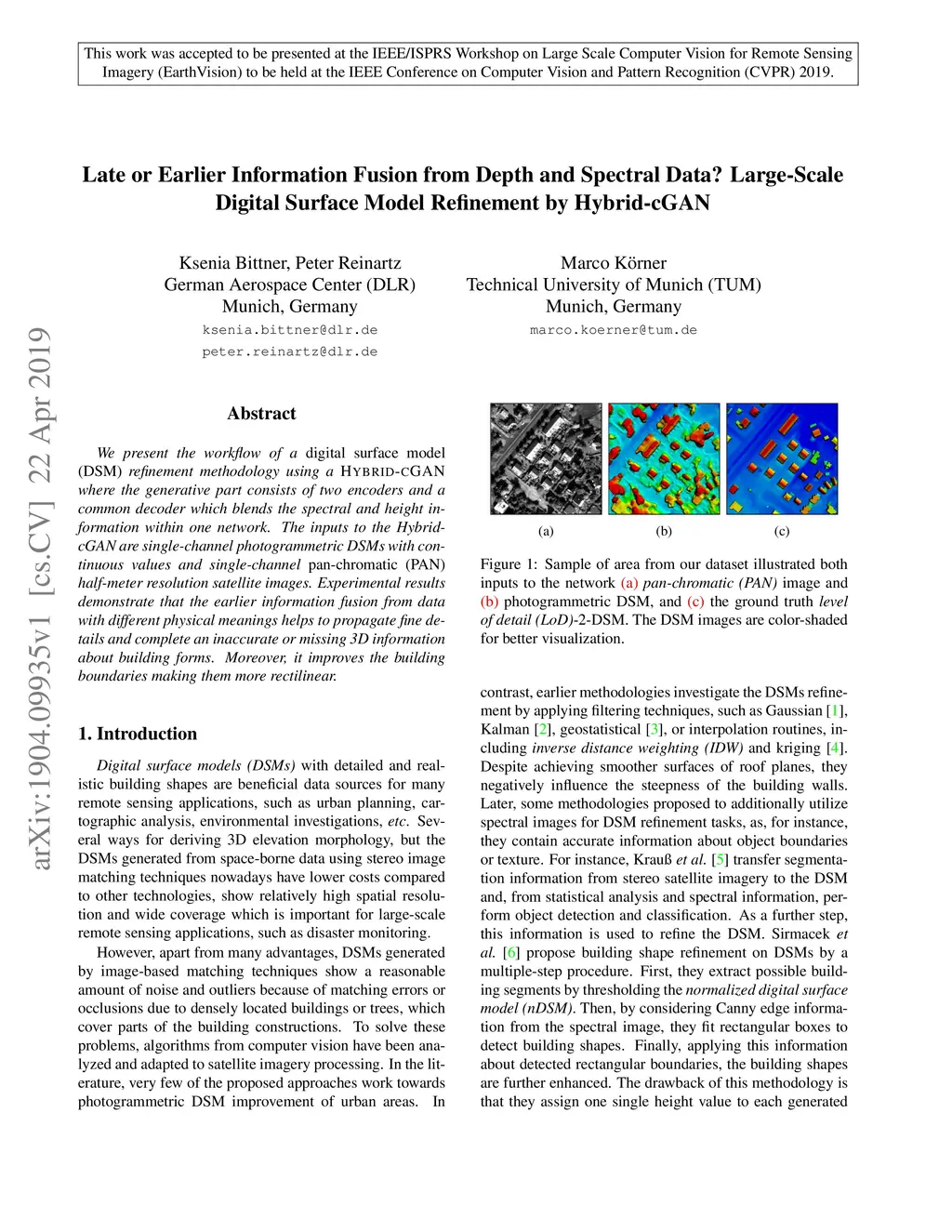 We present the workflow of a DSM refinement methodology using a Hybrid-cGAN where the generative part consists of two encoders and a common decoder which blends the spectral and height information within one network. The inputs to the Hybrid-cGAN are single-channel photogrammetric DSMs with continuous values and single-channel pan-chromatic (PAN) half-meter resolution satellite images. Experimental results demonstrate that the earlier information fusion from data with different physical meanings helps to propagate fine details and complete an inaccurate or missing 3D information about building forms. Moreover, it improves the building boundaries making them more rectilinear.