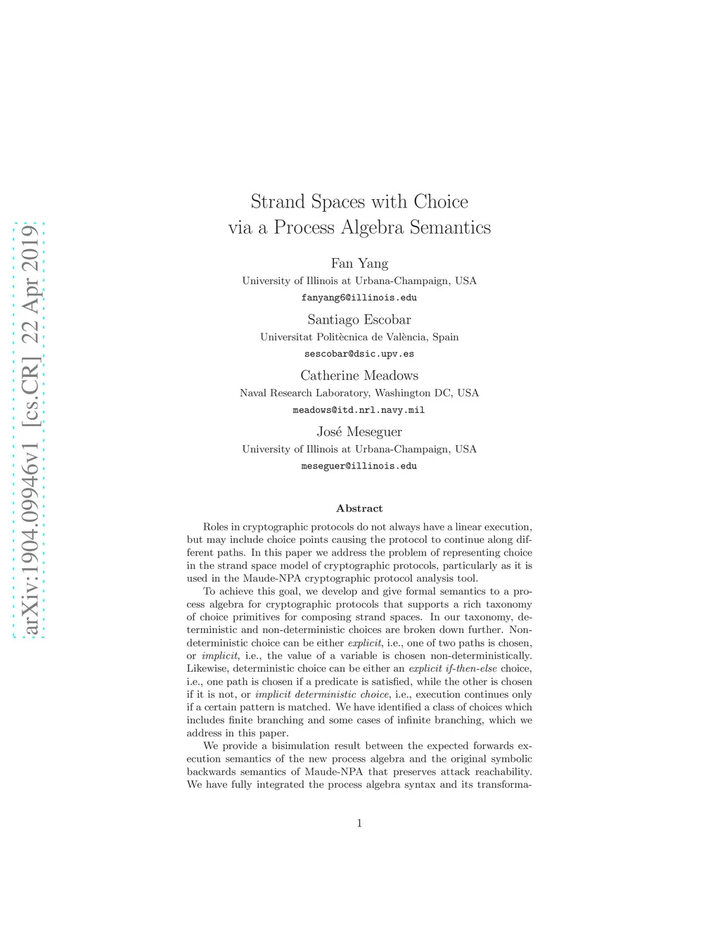 Roles in cryptographic protocols do not always have a linear execution, but may include choice points causing the protocol to continue along different paths. In this paper we address the problem of representing choice in the strand space model of cryptographic protocols, particularly as it is used in the Maude-NPA cryptographic protocol analysis tool. To achieve this goal, we develop and give formal semantics to a process algebra for cryptographic protocols that supports a rich taxonomy of choice primitives for composing strand spaces. In our taxonomy, deterministic and non-deterministic choices are broken down further. Non-deterministic choice can be either explicit, i.e., one of two paths is chosen, or implicit, i.e., the value of a variable is chosen non-deterministically. Likewise, deterministic choice can be either an explicit if-then-else choice, i.e., one path is chosen if a predicate is satisfied, while the other is chosen if it is not, or implicit deterministic choice, i.e., execution continues only if a certain pattern is matched. We have identified a class of choices which includes finite branching and some cases of infinite branching, which we address in this paper. We provide a bisimulation result between the expected forwards execution semantics of the new process algebra and the original symbolic backwards semantics of Maude-NPA that preserves attack reachability. We have fully integrated the process algebra syntax and its transformation into strands in Maude-NPA. We illustrate its expressive power and naturalness with various examples, and show how it can be effectively used in formal analysis. This allows users to write protocols from now on using the process syntax, which is more convenient for expressing choice than the strand space syntax, in which choice can only be specified implicitly, via two or more strands that are identical until the choice point.