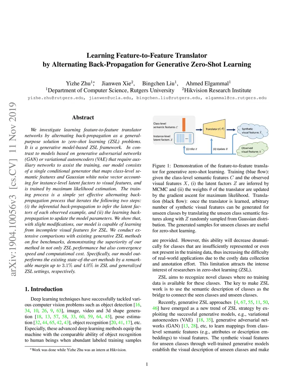 We investigate learning feature-to-feature translator networks by alternating back-propagation as a general-purpose solution to zero-shot learning (ZSL) problems. It is a generative model-based ZSL framework. In contrast to models based on generative adversarial networks (GAN) or variational autoencoders (VAE) that require auxiliary networks to assist the training, our model consists of a single conditional generator that maps class-level semantic features and Gaussian white noise vector accounting for instance-level latent factors to visual features, and is trained by maximum likelihood estimation. The training process is a simple yet effective alternating back-propagation process that iterates the following two steps: (i) the inferential back-propagation to infer the latent factors of each observed example, and (ii) the learning back-propagation to update the model parameters. We show that, with slight modifications, our model is capable of learning from incomplete visual features for ZSL. We conduct extensive comparisons with existing generative ZSL methods on five benchmarks, demonstrating the superiority of our method in not only ZSL performance but also convergence speed and computational cost. Specifically, our model outperforms the existing state-of-the-art methods by a remarkable margin up to 3.1% and 4.0% in ZSL and generalized ZSL settings, respectively.