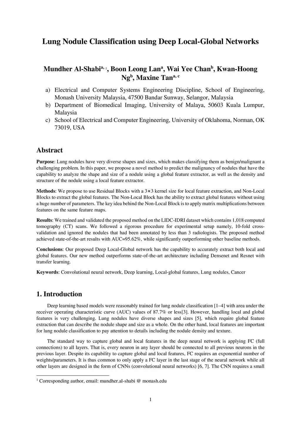 Purpose: Lung nodules have very diverse shapes and sizes, which makes classifying them as benign/malignant a challenging problem. In this paper, we propose a novel method to predict the malignancy of nodules that have the capability to analyze the shape and size of a nodule using a global feature extractor, as well as the density and structure of the nodule using a local feature extractor. Methods: We propose to use Residual Blocks with a 3x3 kernel size for local feature extraction, and Non-Local Blocks to extract the global features. The Non-Local Block has the ability to extract global features without using a huge number of parameters. The key idea behind the Non-Local Block is to apply matrix multiplications between features on the same feature maps. Results: We trained and validated the proposed method on the LIDC-IDRI dataset which contains 1,018 computed tomography (CT) scans. We followed a rigorous procedure for experimental setup namely, 10-fold cross-validation and ignored the nodules that had been annotated by less than 3 radiologists. The proposed method achieved state-of-the-art results with AUC=95.62%, while significantly outperforming other baseline methods. Conclusions: Our proposed Deep Local-Global network has the capability to accurately extract both local and global features. Our new method outperforms state-of-the-art architecture including Densenet and Resnet with transfer learning.