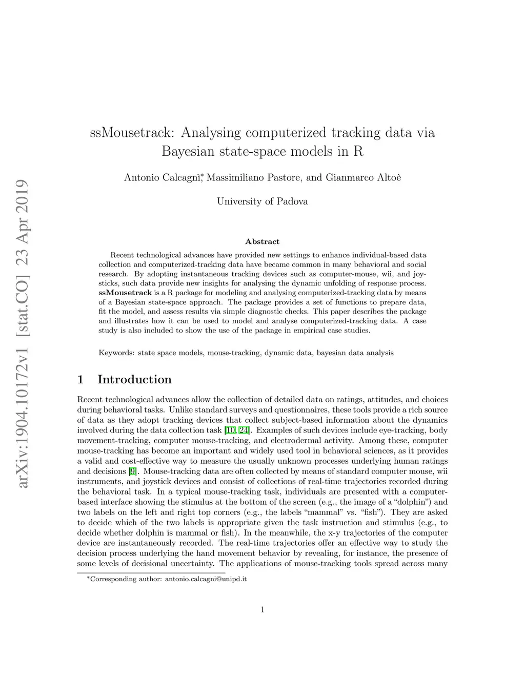 Recent technological advances have provided new settings to enhance individual-based data collection and computerized-tracking data have became common in many behavioral and social research. By adopting instantaneous tracking devices such as computer-mouse, wii, and joysticks, such data provide new insights for analysing the dynamic unfolding of response process. ssMousetrack is a R package for modeling and analysing computerized-tracking data by means of a Bayesian state-space approach. The package provides a set of functions to prepare data, fit the model, and assess results via simple diagnostic checks. This paper describes the package and illustrates how it can be used to model and analyse computerized-tracking data. A case study is also included to show the use of the package in empirical case studies.