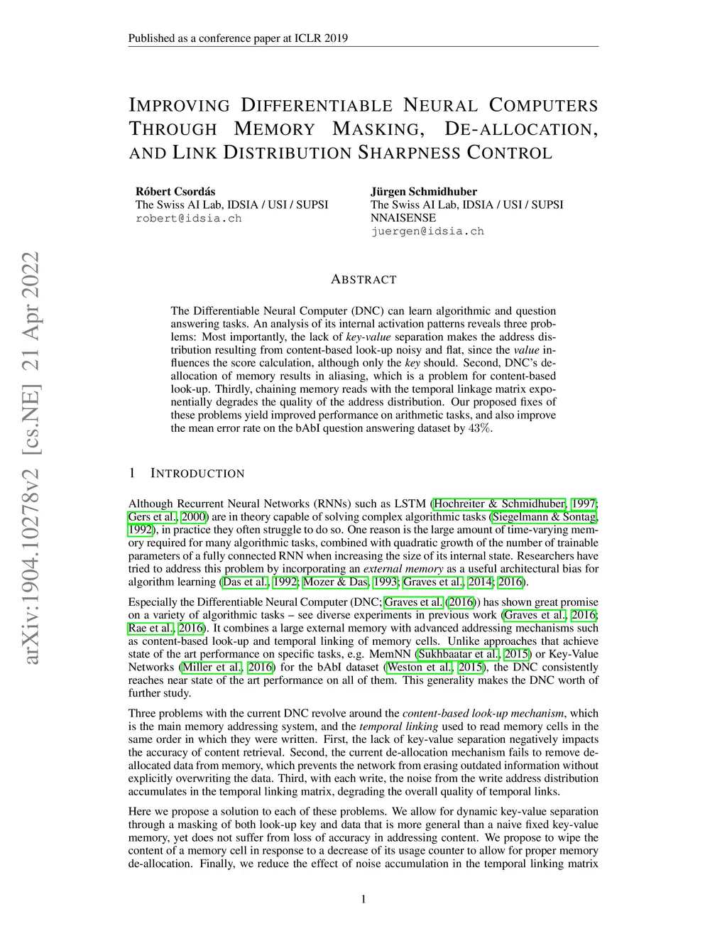 The Differentiable Neural Computer (DNC) can learn algorithmic and question answering tasks. An analysis of its internal activation patterns reveals three problems: Most importantly, the lack of key-value separation makes the address distribution resulting from content-based look-up noisy and flat, since the value influences the score calculation, although only the key should. Second, DNC's de-allocation of memory results in aliasing, which is a problem for content-based look-up. Thirdly, chaining memory reads with the temporal linkage matrix exponentially degrades the quality of the address distribution. Our proposed fixes of these problems yield improved performance on arithmetic tasks, and also improve the mean error rate on the bAbI question answering dataset by 43%.