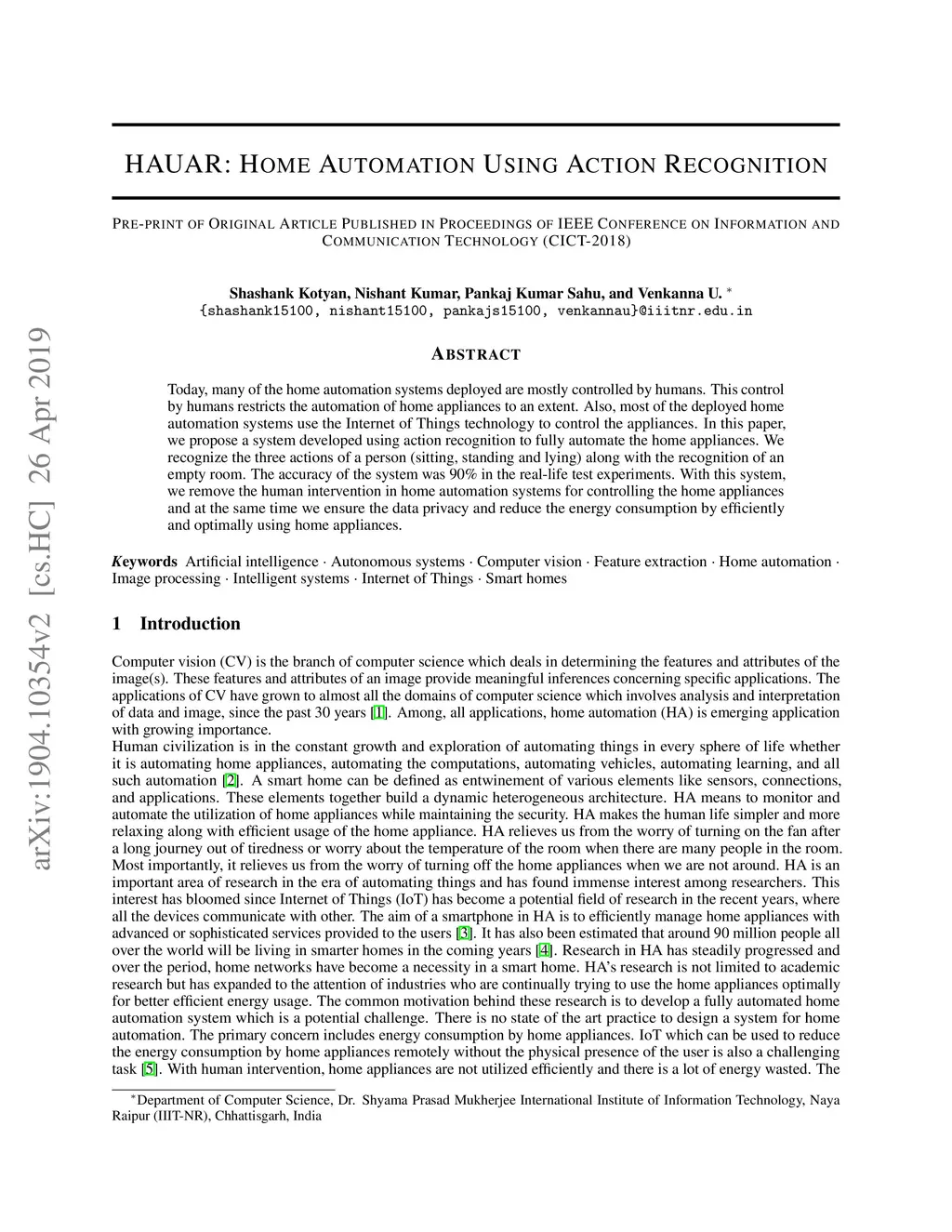 Today, many of the home automation systems deployed are mostly controlled by humans. This control by humans restricts the automation of home appliances to an extent. Also, most of the deployed home automation systems use the Internet of Things technology to control the appliances. In this paper, we propose a system developed using action recognition to fully automate the home appliances. We recognize the three actions of a person (sitting, standing and lying) along with the recognition of an empty room. The accuracy of the system was 90% in the real-life test experiments. With this system, we remove the human intervention in home automation systems for controlling the home appliances and at the same time we ensure the data privacy and reduce the energy consumption by efficiently and optimally using home appliances.
