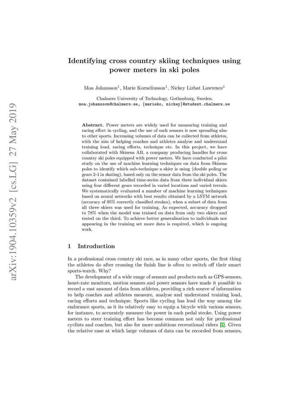Power meters are becoming a widely used tool for measuring training and racing effort in cycling, and are now spreading also to other sports. This means that increasing volumes of data can be collected from athletes, with the aim of helping coaches and athletes analyse and understanding training load, racing efforts, technique etc. In this project, we have collaborated with Skisens AB, a company producing handles for cross country ski poles equipped with power meters. We have conducted a pilot study in the use of machine learning techniques on data from Skisens poles to identify which "gear" a skier is using (double poling or gears 2-4 in skating), based only on the sensor data from the ski poles. The dataset for this pilot study contained labelled time-series data from three individual skiers using four different gears recorded in varied locations and varied terrain. We systematically evaluated a number of machine learning techniques based on neural networks with best results obtained by a LSTM network (accuracy of 95% correctly classified strokes), when a subset of data from all three skiers was used for training. As expected, accuracy dropped to 78% when the model was trained on data from only two skiers and tested on the third. To achieve better generalisation to individuals not appearing in the training set more data is required, which is ongoing work.