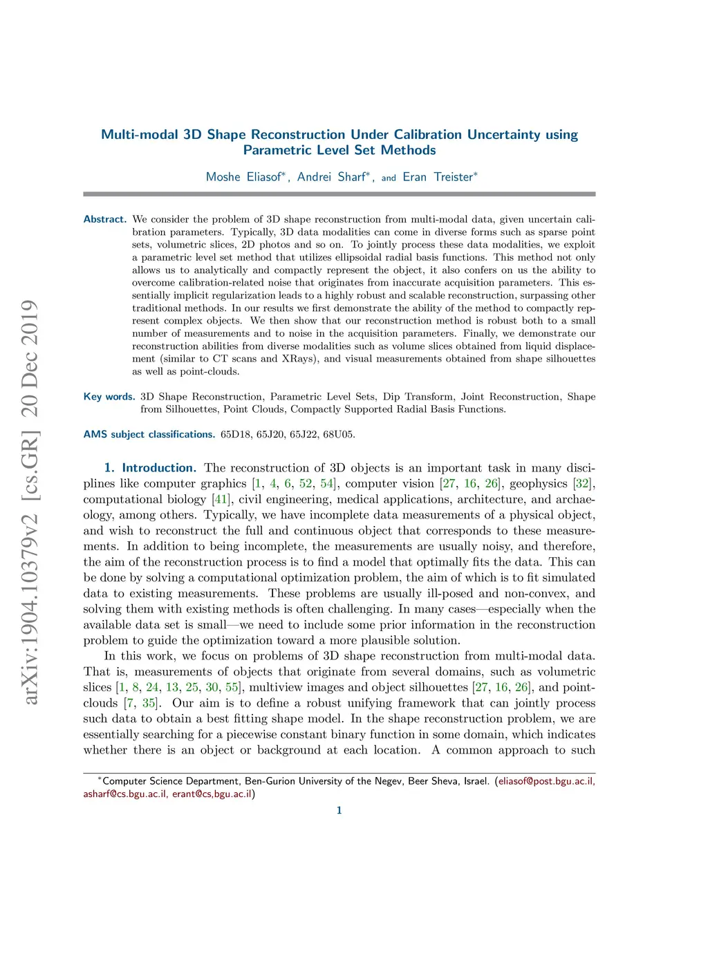 We consider the problem of 3D shape reconstruction from multi-modal data, given uncertain calibration parameters. Typically, 3D data modalities can be in diverse forms such as sparse point sets, volumetric slices, 2D photos and so on. To jointly process these data modalities, we exploit a parametric level set method that utilizes ellipsoidal radial basis functions. This method not only allows us to analytically and compactly represent the object, it also confers on us the ability to overcome calibration related noise that originates from inaccurate acquisition parameters. This essentially implicit regularization leads to a highly robust and scalable reconstruction, surpassing other traditional methods. In our results we first demonstrate the ability of the method to compactly represent complex objects. We then show that our reconstruction method is robust both to a small number of measurements and to noise in the acquisition parameters. Finally, we demonstrate our reconstruction abilities from diverse modalities such as volume slices obtained from liquid displacement (similar to CTscans and XRays), and visual measurements obtained from shape silhouettes.