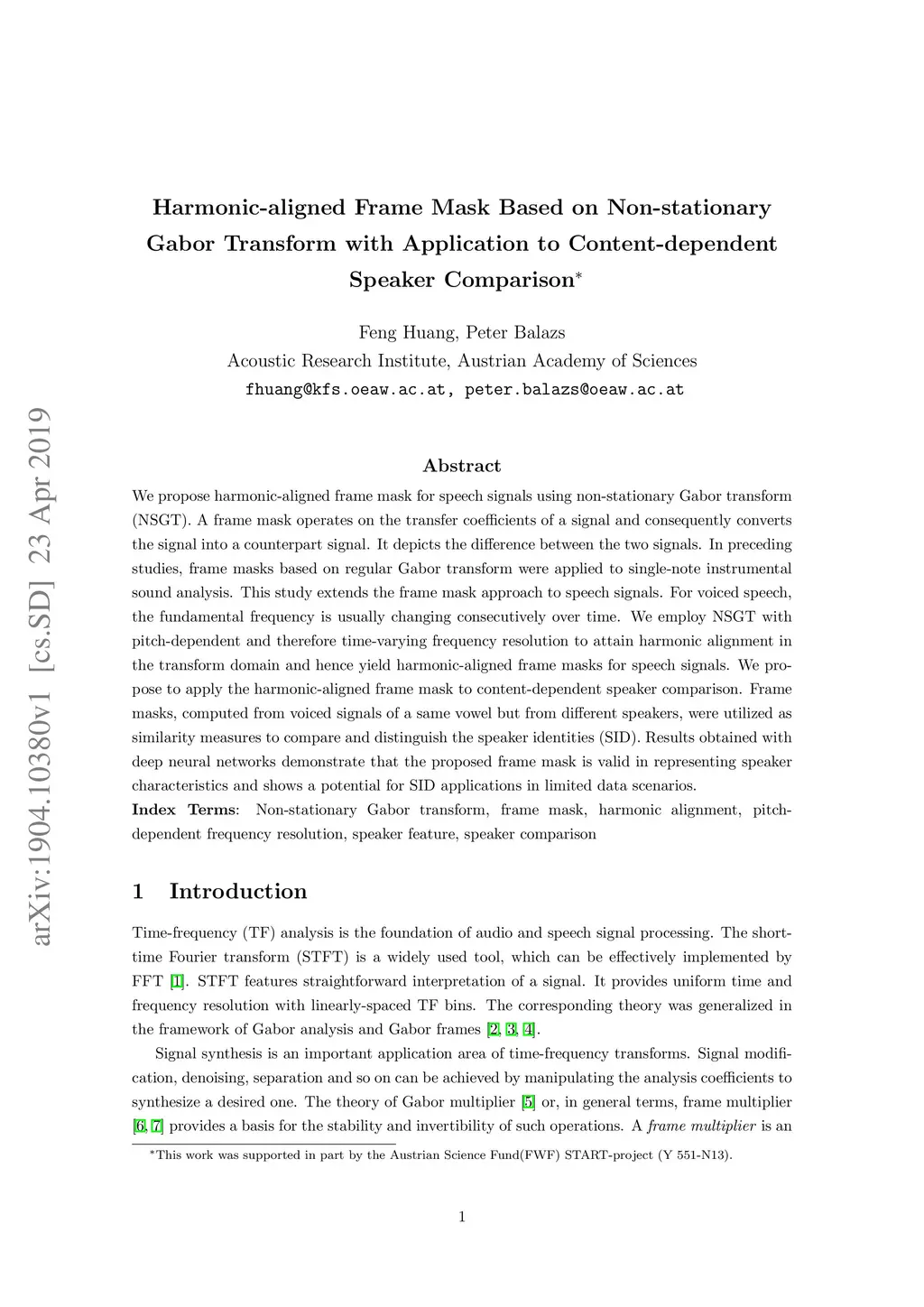 We propose harmonic-aligned frame mask for speech signals using non-stationary Gabor transform (NSGT). A frame mask operates on the transfer coefficients of a signal and consequently converts the signal into a counterpart signal. It depicts the difference between the two signals. In preceding studies, frame masks based on regular Gabor transform were applied to single-note instrumental sound analysis. This study extends the frame mask approach to speech signals. For voiced speech, the fundamental frequency is usually changing consecutively over time. We employ NSGT with pitch-dependent and therefore time-varying frequency resolution to attain harmonic alignment in the transform domain and hence yield harmonic-aligned frame masks for speech signals. We propose to apply the harmonic-aligned frame mask to content-dependent speaker comparison. Frame masks, computed from voiced signals of a same vowel but from different speakers, were utilized as similarity measures to compare and distinguish the speaker identities (SID). Results obtained with deep neural networks demonstrate that the proposed frame mask is valid in representing speaker characteristics and shows a potential for SID applications in limited data scenarios.
