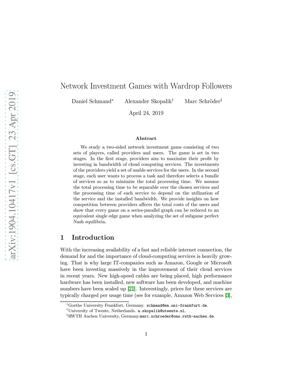 We study a two-sided network investment game consisting of two sets of players, called providers and users. The game is set in two stages. In the first stage, providers aim to maximize their profit by investing in bandwidth of cloud computing services. The investments of the providers yield a set of usable services for the users. In the second stage, each user wants to process a task and therefore selects a bundle of services so as to minimize the total processing time. We assume the total processing time to be separable over the chosen services and the processing time of each service to depend on the utilization of the service and the installed bandwidth. We provide insights on how competition between providers affects the total costs of the users and show that every game on a series-parallel graph can be reduced to an equivalent single edge game when analyzing the set of subgame perfect Nash equilibria.