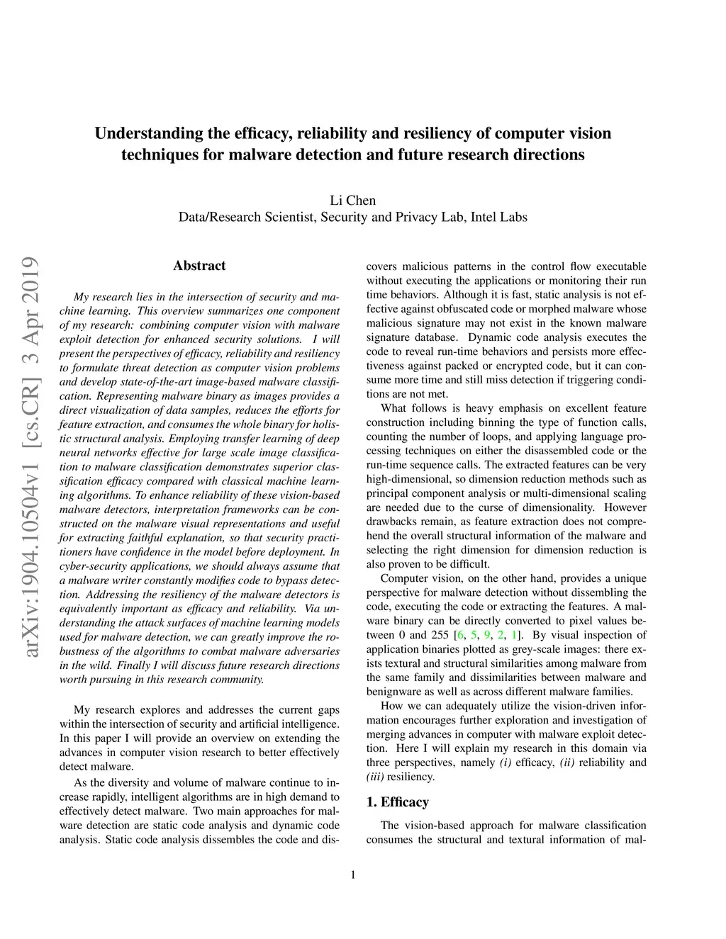My research lies in the intersection of security and machine learning. This overview summarizes one component of my research: combining computer vision with malware exploit detection for enhanced security solutions. I will present the perspectives of efficacy, reliability and resiliency to formulate threat detection as computer vision problems and develop state-of-the-art image-based malware classification. Representing malware binary as images provides a direct visualization of data samples, reduces the efforts for feature extraction, and consumes the whole binary for holistic structural analysis. Employing transfer learning of deep neural networks effective for large scale image classification to malware classification demonstrates superior classification efficacy compared with classical machine learning algorithms. To enhance reliability of these vision-based malware detectors, interpretation frameworks can be constructed on the malware visual representations and useful for extracting faithful explanation, so that security practitioners have confidence in the model before deployment. In cyber-security applications, we should always assume that a malware writer constantly modifies code to bypass detection. Addressing the resiliency of the malware detectors is equivalently important as efficacy and reliability. Via understanding the attack surfaces of machine learning models used for malware detection, we can greatly improve the robustness of the algorithms to combat malware adversaries in the wild. Finally I will discuss future research directions worth pursuing in this research community.