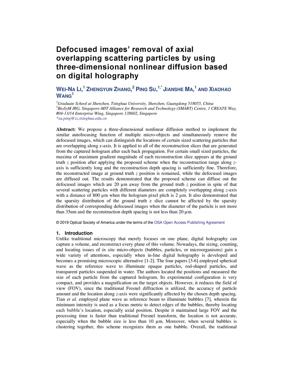 We propose a three-dimensional nonlinear diffusion method to implement the similar autofocusing function of multiple micro-objects and simultaneously remove the defocused images, which can distinguish the locations of certain sized scattering particles that are overlapping along z-axis. It is applied to all of the reconstruction slices that are generated from the captured hologram after each back propagation. For certain small sized particles, the maxima of maximum gradient magnitude of each reconstruction slice appears at the ground truth z position after applying the proposed scheme when the reconstruction range along z-axis is sufficiently long and the reconstruction depth spacing is sufficiently fine. Therefore, the reconstructed image at ground truth z position is remained, while the defocused images are diffused out. The results demonstrated that the proposed scheme can diffuse out the defocused images which are 20 um away from the ground truth z position in spite of that several scattering particles with different diameters are completely overlapping along z-axis with a distance of 800 um when the hologram pixel pitch is 2 um. It also demonstrated that the sparsity distribution of the ground truth z slice cannot be affected by the sparsity distribution of corresponding defocused images when the diameter of the particle is not more than 35um and the reconstruction depth spacing is not less than 20 um.