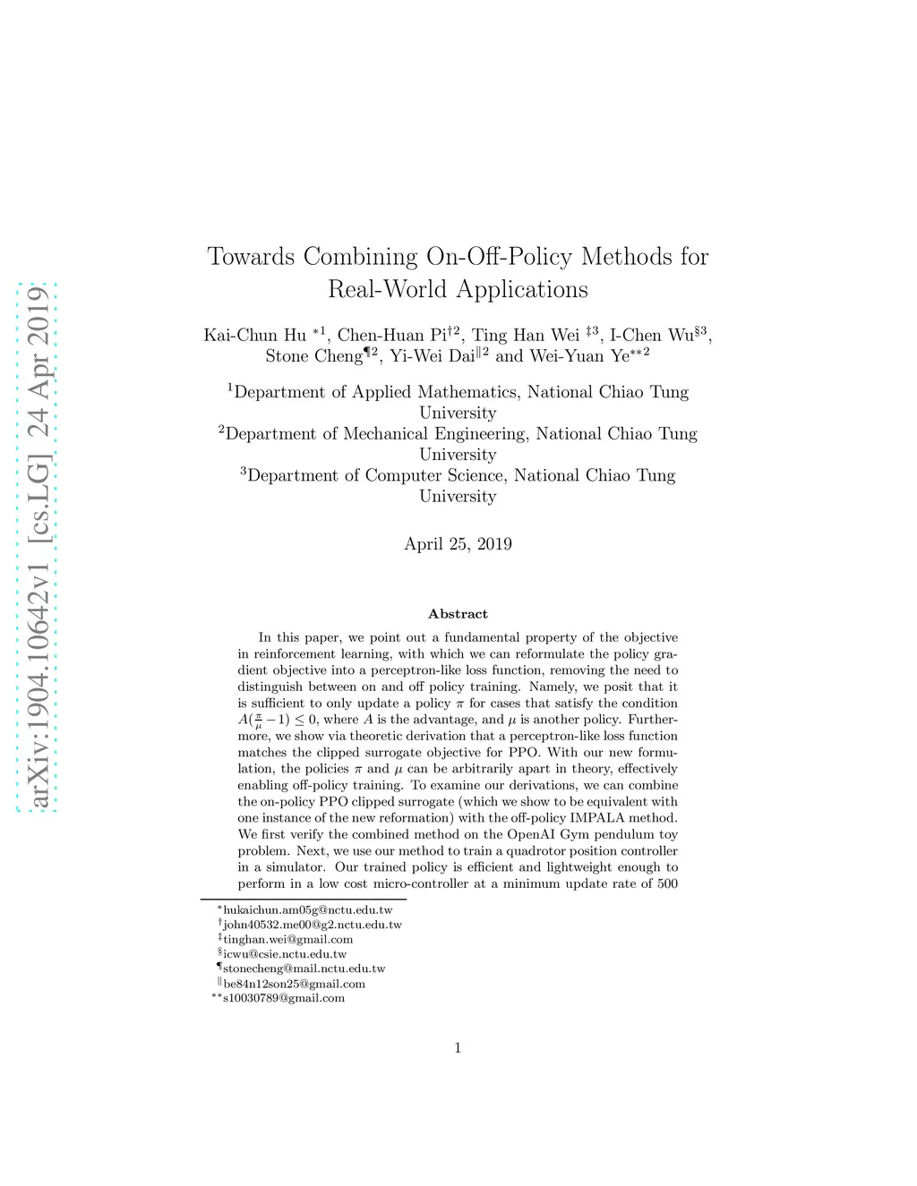 In this paper, we point out a fundamental property of the objective in reinforcement learning, with which we can reformulate the policy gradient objective into a perceptron-like loss function, removing the need to distinguish between on and off policy training. Namely, we posit that it is sufficient to only update a policy for cases that satisfy the condition , where is the advantage, and is another policy. Furthermore, we show via theoretic derivation that a perceptron-like loss function matches the clipped surrogate objective for PPO. With our new formulation, the policies and can be arbitrarily apart in theory, effectively enabling off-policy training. To examine our derivations, we can combine the on-policy PPO clipped surrogate (which we show to be equivalent with one instance of the new reformation) with the off-policy IMPALA method. We first verify the combined method on the OpenAI Gym pendulum toy problem. Next, we use our method to train a quadrotor position controller in a simulator. Our trained policy is efficient and lightweight enough to perform in a low cost micro-controller at a minimum update rate of 500 Hz. For the quadrotor, we show two experiments to verify our method and demonstrate performance: 1) hovering at a fixed position, and 2) tracking along a specific trajectory. In preliminary trials, we are also able to apply the method to a real-world quadrotor.