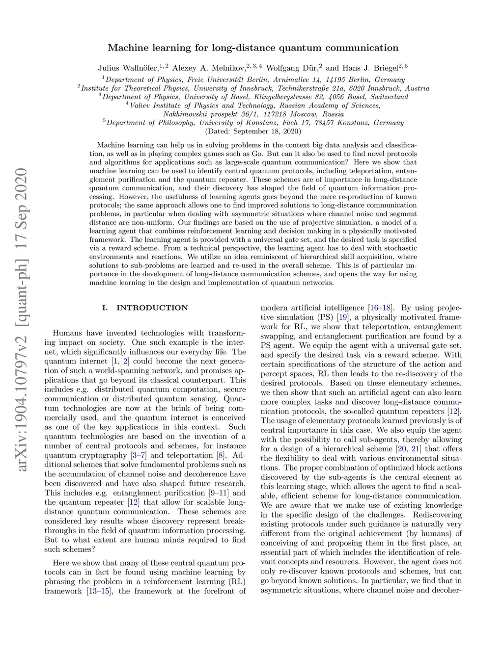 Machine learning can help us in solving problems in the context big data analysis and classification, as well as in playing complex games such as Go. But can it also be used to find novel protocols and algorithms for applications such as large-scale quantum communication? Here we show that machine learning can be used to identify central quantum protocols, including teleportation, entanglement purification and the quantum repeater. These schemes are of importance in long-distance quantum communication, and their discovery has shaped the field of quantum information processing. However, the usefulness of learning agents goes beyond the mere re-production of known protocols; the same approach allows one to find improved solutions to long-distance communication problems, in particular when dealing with asymmetric situations where channel noise and segment distance are non-uniform. Our findings are based on the use of projective simulation, a model of a learning agent that combines reinforcement learning and decision making in a physically motivated framework. The learning agent is provided with a universal gate set, and the desired task is specified via a reward scheme. From a technical perspective, the learning agent has to deal with stochastic environments and reactions. We utilize an idea reminiscent of hierarchical skill acquisition, where solutions to sub-problems are learned and re-used in the overall scheme. This is of particular importance in the development of long-distance communication schemes, and opens the way for using machine learning in the design and implementation of quantum networks.