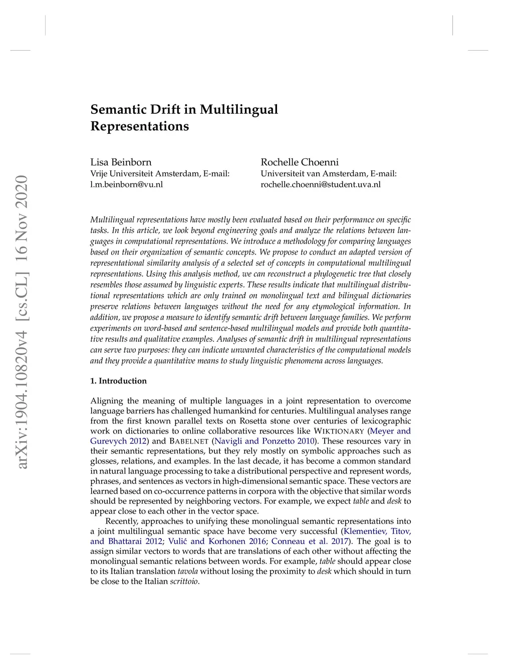 Multilingual representations have mostly been evaluated based on their performance on specific tasks. In this article, we look beyond engineering goals and analyze the relations between languages in computational representations. We introduce a methodology for comparing languages based on their organization of semantic concepts. We propose to conduct an adapted version of representational similarity analysis of a selected set of concepts in computational multilingual representations. Using this analysis method, we can reconstruct a phylogenetic tree that closely resembles those assumed by linguistic experts. These results indicate that multilingual distributional representations which are only trained on monolingual text and bilingual dictionaries preserve relations between languages without the need for any etymological information. In addition, we propose a measure to identify semantic drift between language families. We perform experiments on word-based and sentence-based multilingual models and provide both quantitative results and qualitative examples. Analyses of semantic drift in multilingual representations can serve two purposes: they can indicate unwanted characteristics of the computational models and they provide a quantitative means to study linguistic phenomena across languages. The code is available at https://github.com/beinborn/SemanticDrift.