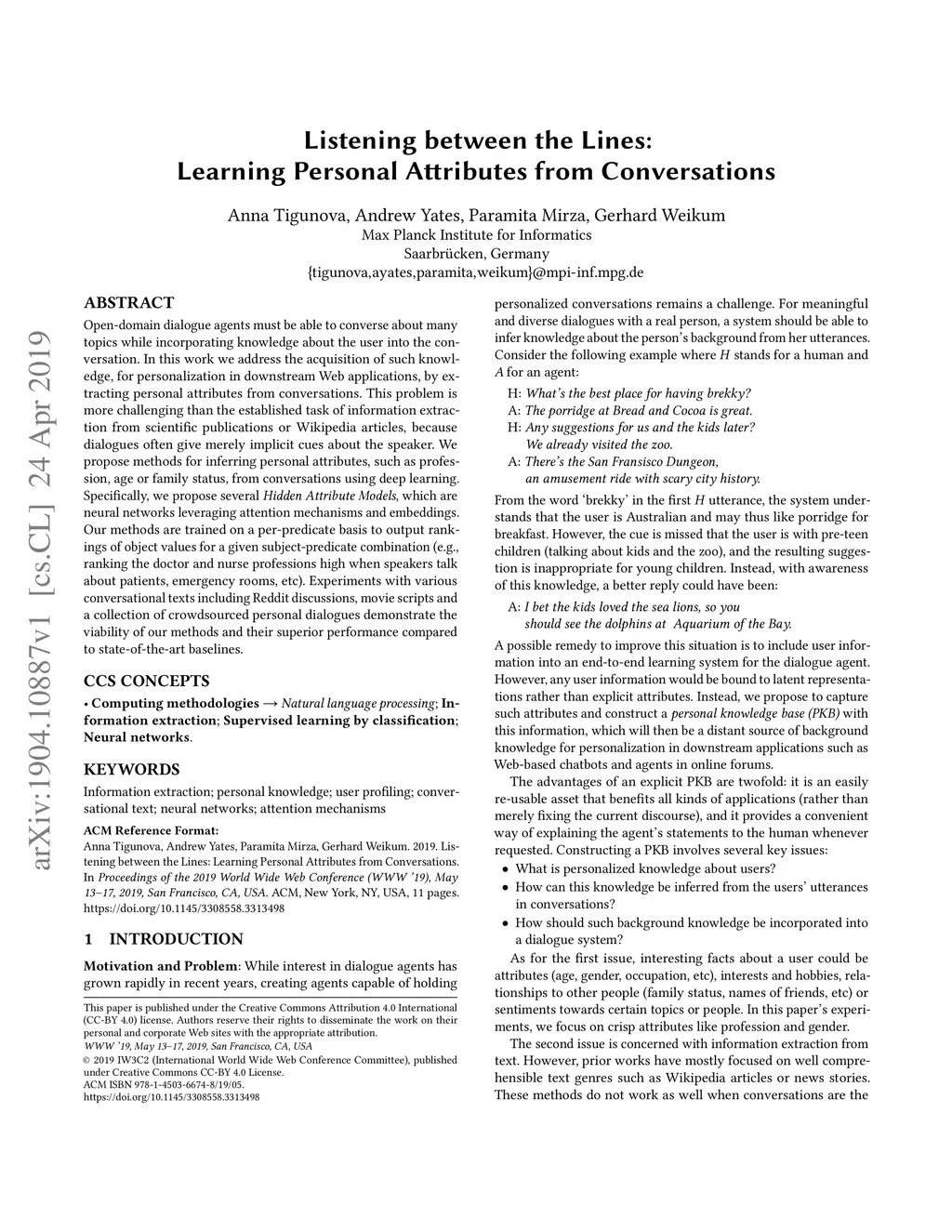 Open-domain dialogue agents must be able to converse about many topics while incorporating knowledge about the user into the conversation. In this work we address the acquisition of such knowledge, for personalization in downstream Web applications, by extracting personal attributes from conversations. This problem is more challenging than the established task of information extraction from scientific publications or Wikipedia articles, because dialogues often give merely implicit cues about the speaker. We propose methods for inferring personal attributes, such as profession, age or family status, from conversations using deep learning. Specifically, we propose several Hidden Attribute Models, which are neural networks leveraging attention mechanisms and embeddings. Our methods are trained on a per-predicate basis to output rankings of object values for a given subject-predicate combination (e.g., ranking the doctor and nurse professions high when speakers talk about patients, emergency rooms, etc). Experiments with various conversational texts including Reddit discussions, movie scripts and a collection of crowdsourced personal dialogues demonstrate the viability of our methods and their superior performance compared to state-of-the-art baselines.