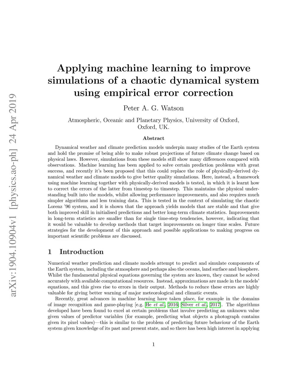 Dynamical weather and climate prediction models underpin many studies of the Earth system and hold the promise of being able to make robust projections of future climate change based on physical laws. However, simulations from these models still show many differences compared with observations. Machine learning has been applied to solve certain prediction problems with great success, and recently it's been proposed that this could replace the role of physically-derived dynamical weather and climate models to give better quality simulations. Here, instead, a framework using machine learning together with physically-derived models is tested, in which it is learnt how to correct the errors of the latter from timestep to timestep. This maintains the physical understanding built into the models, whilst allowing performance improvements, and also requires much simpler algorithms and less training data. This is tested in the context of simulating the chaotic Lorenz '96 system, and it is shown that the approach yields models that are stable and that give both improved skill in initialised predictions and better long-term climate statistics. Improvements in long-term statistics are smaller than for single time-step tendencies, however, indicating that it would be valuable to develop methods that target improvements on longer time scales. Future strategies for the development of this approach and possible applications to making progress on important scientific problems are discussed.