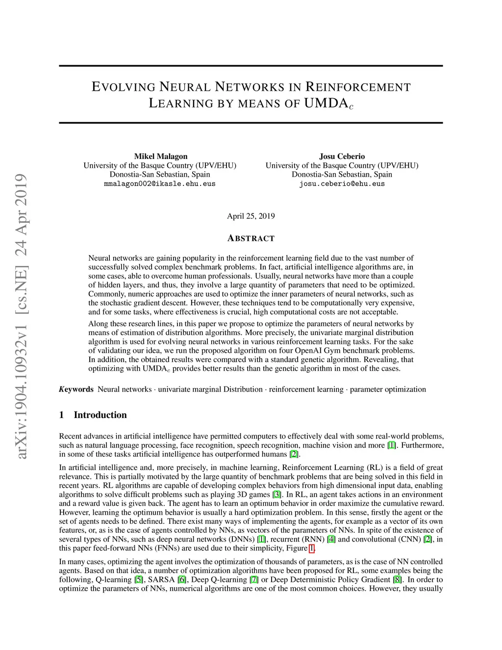 Evolving Neural Networks in Reinforcement Learning by means of UMDAc